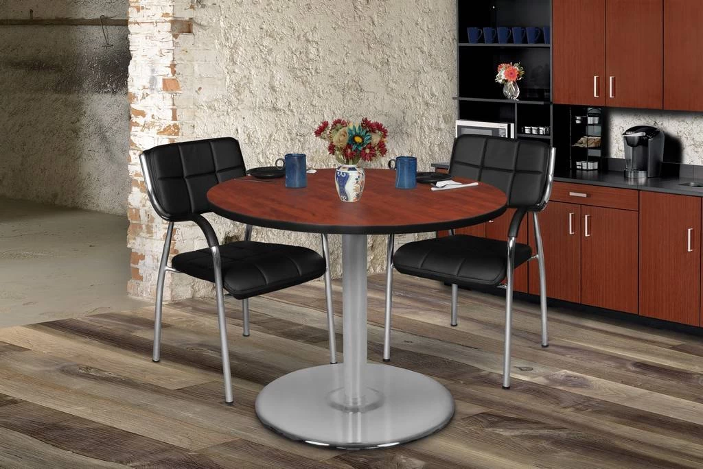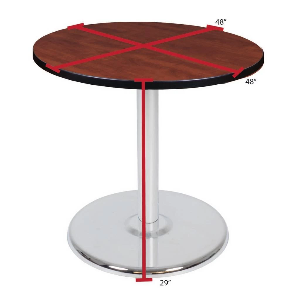 No matter what room you’re planning, plan it with Cain tables. These modern tables are a perfect fit in stylish café or coffee shop settings as well as lunch rooms, kitchens or common work areas. This 48-inch round table is constructed of a thermal fused melamine laminate tabletop that is 1-inch thick and finished with a black T-Mold edge band. This Cherry tabletop is double-sided and finished in Maple on the other side. Simply pick the side you like and install the base on the other. Self tapping wood screws and a placement template are included. Laminates are scratch, stain and scald resistant and wipe clean easily. The modern, round platter-style base is constructed of durable stamped steel that is built to withstand daily wear and tear and has a chrome finish that is sure to match any . Hidden adjustable glides keep the tabletop level and are easy to adjust. Cain tables are backed by a 10-Year Limited Manufacturer’s Warranty.