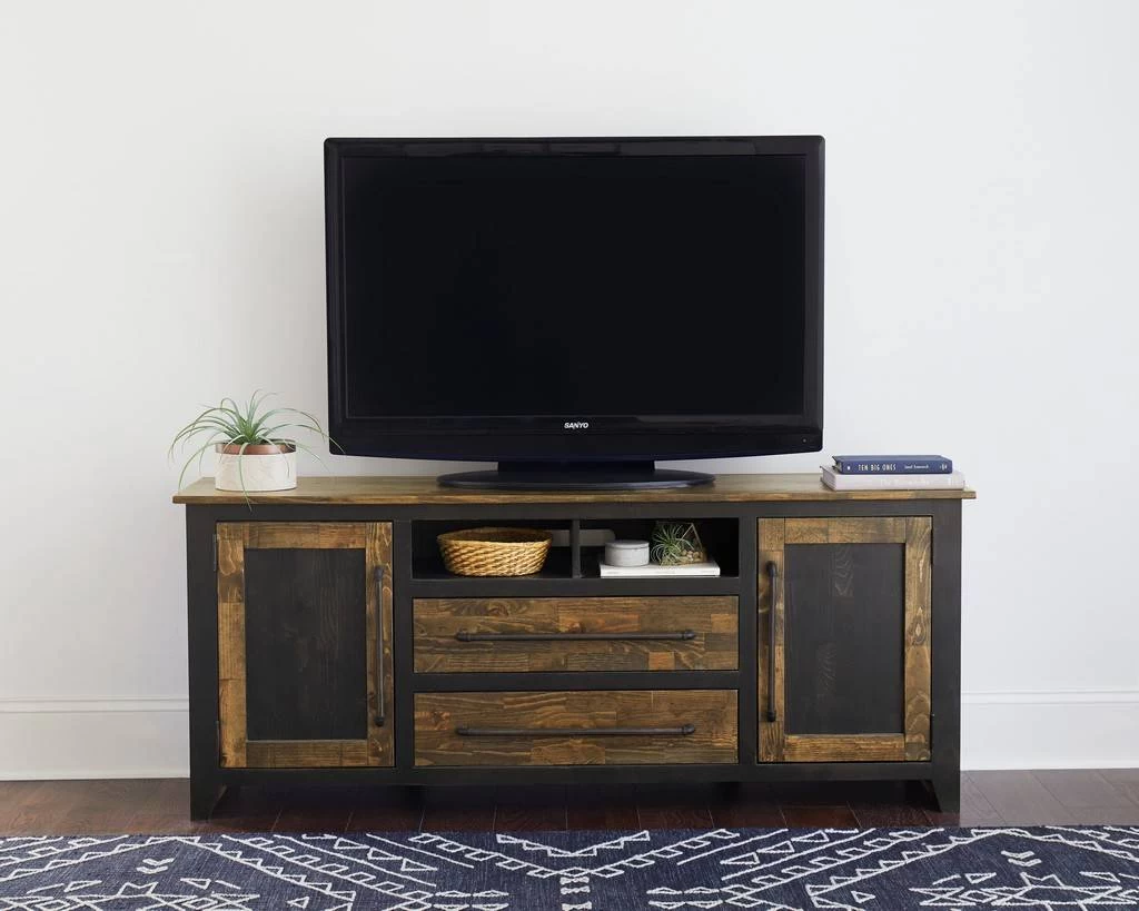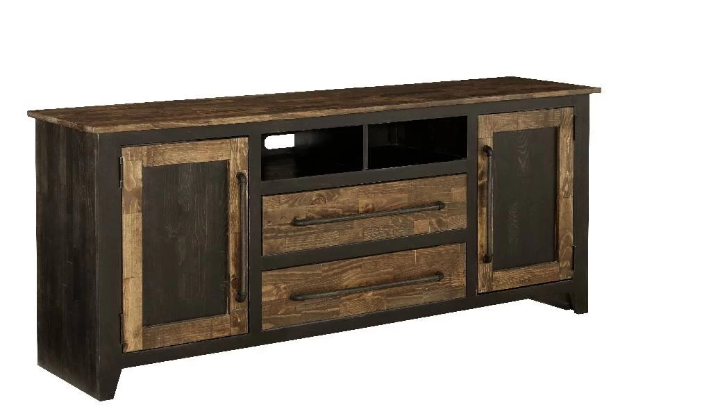 A winning combination of pine solids, framed doors, mitered feet, and oversized industrial pulls make this an obvious choice for your media storage needs. This 68 console features generously large pulls that consists of metal ends with a wooden handle that is finished dark to match the contrasting black finish. Open shelving for media components, two cabinets, two large drawers, metal drawer guides, adjustable shelving, and cutouts in the back panel for wire management. Contrasting black finish on front frame and legs/butcher block wood in a honey tone.