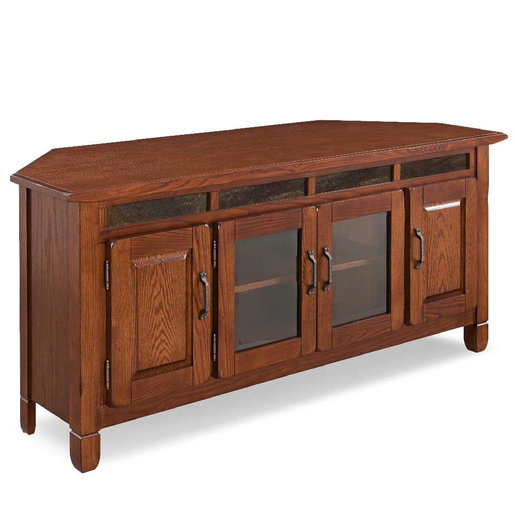 This sturdy oak Corner TV Console will hold TVs up to 62inch with surface area to accomodate a sound bar or surround speakers. Running slate tile details support an underbeveled top and plentiful furniture details like raised wood panels and hammered texture, pewter hardware. Four doors across the front offer behind glass component access and enclosed storage behind raised panel wood doors, each bay outfillted with adjustable shelves. Designed and manufactured by Leick Home, the trusted source for quality home furnishings for every taste and budget.