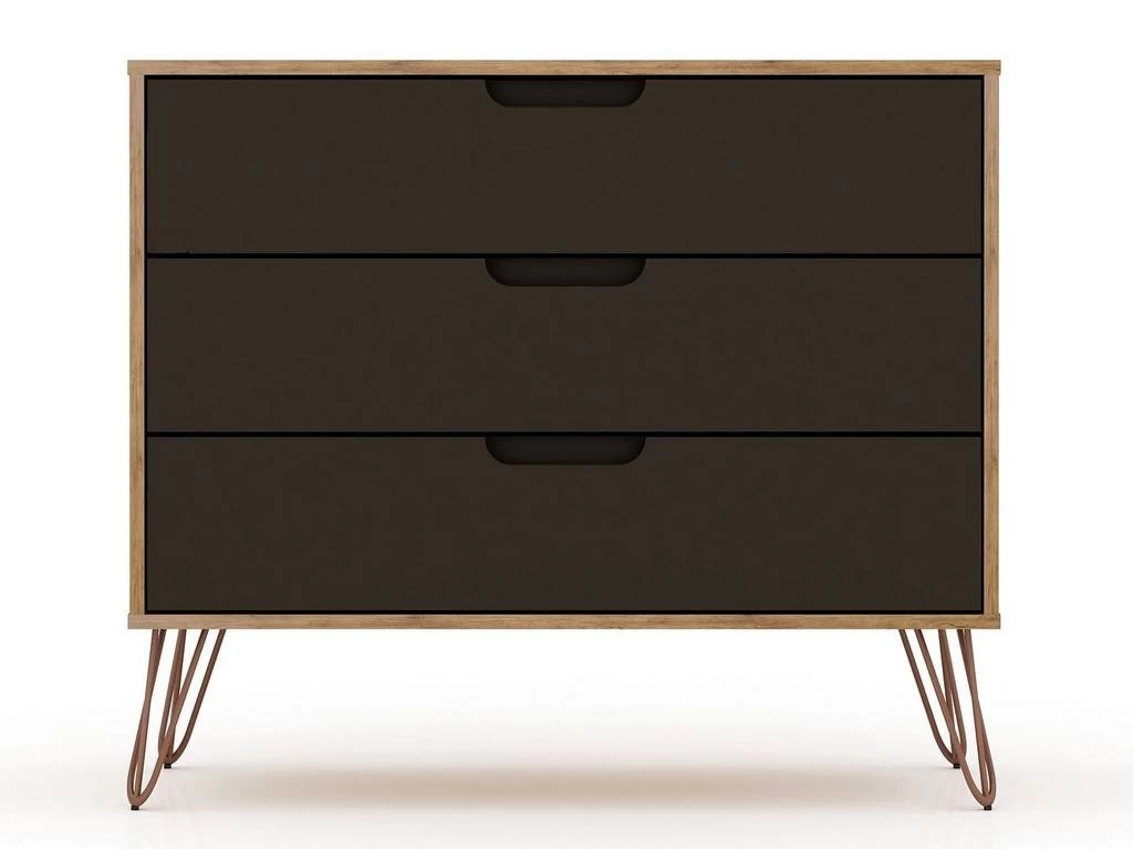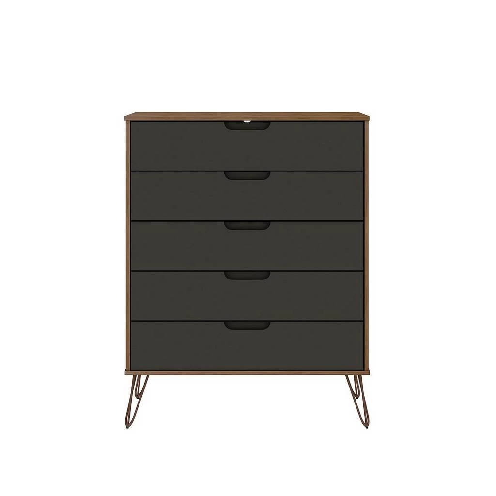 The Rockefeller dresser is the perfect accompaniment to any space, with ample storage and minimalistic Mid-century modern style. Cutout handles keep the piece feeling fresh with five drawers made easy for stowing away clothing, personal items, and beyond. A display top allows for sharing favorite framed family photos, travel trinkets, perfume trays, or a decorative lamp. Set it under a mirror or painting to complete your space with this instant bedroom focal point.