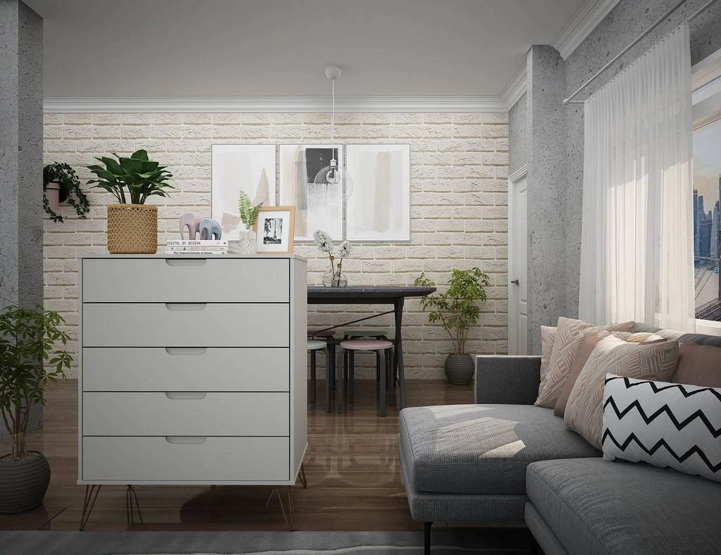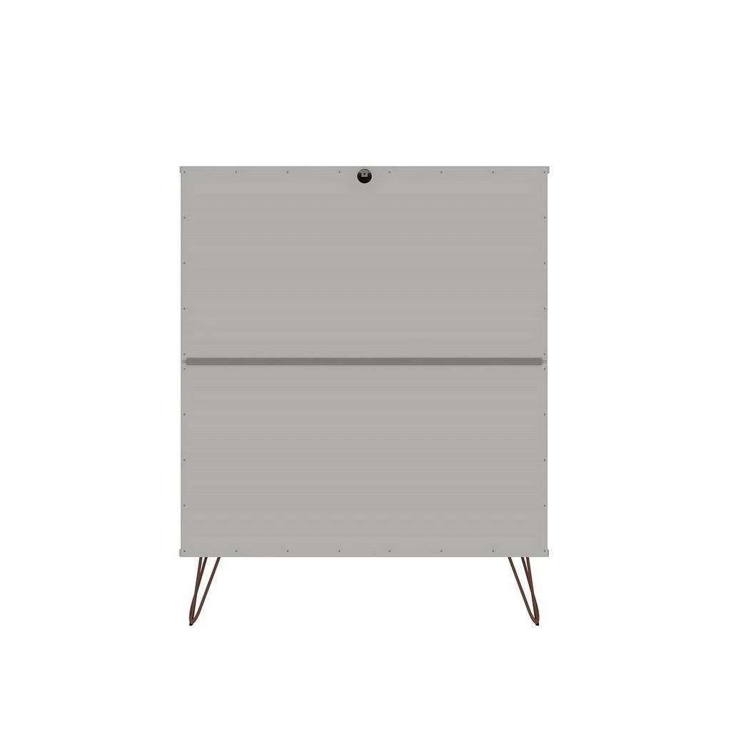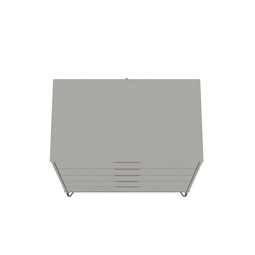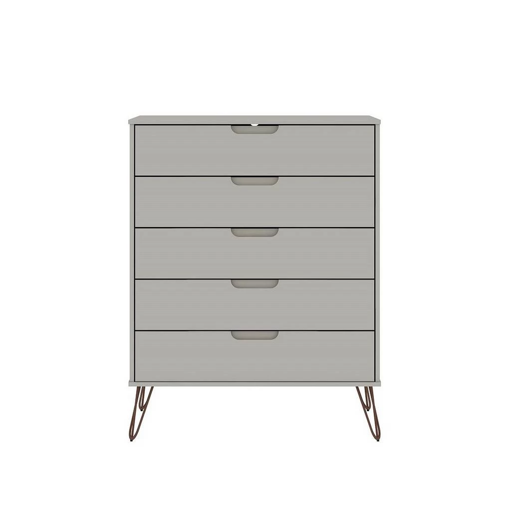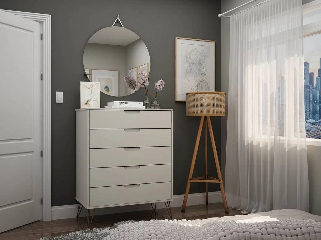 The Rockefeller dresser is the perfect accompaniment to any space, with ample storage and minimalistic Mid-century modern style. Cutout handles keep the piece feeling fresh with five drawers made easy for stowing away clothing, personal items, and beyond. A display top allows for sharing favorite framed family photos, travel trinkets, perfume trays, or a decorative lamp. Set it under a mirror or painting to complete your space with this instant bedroom focal point.