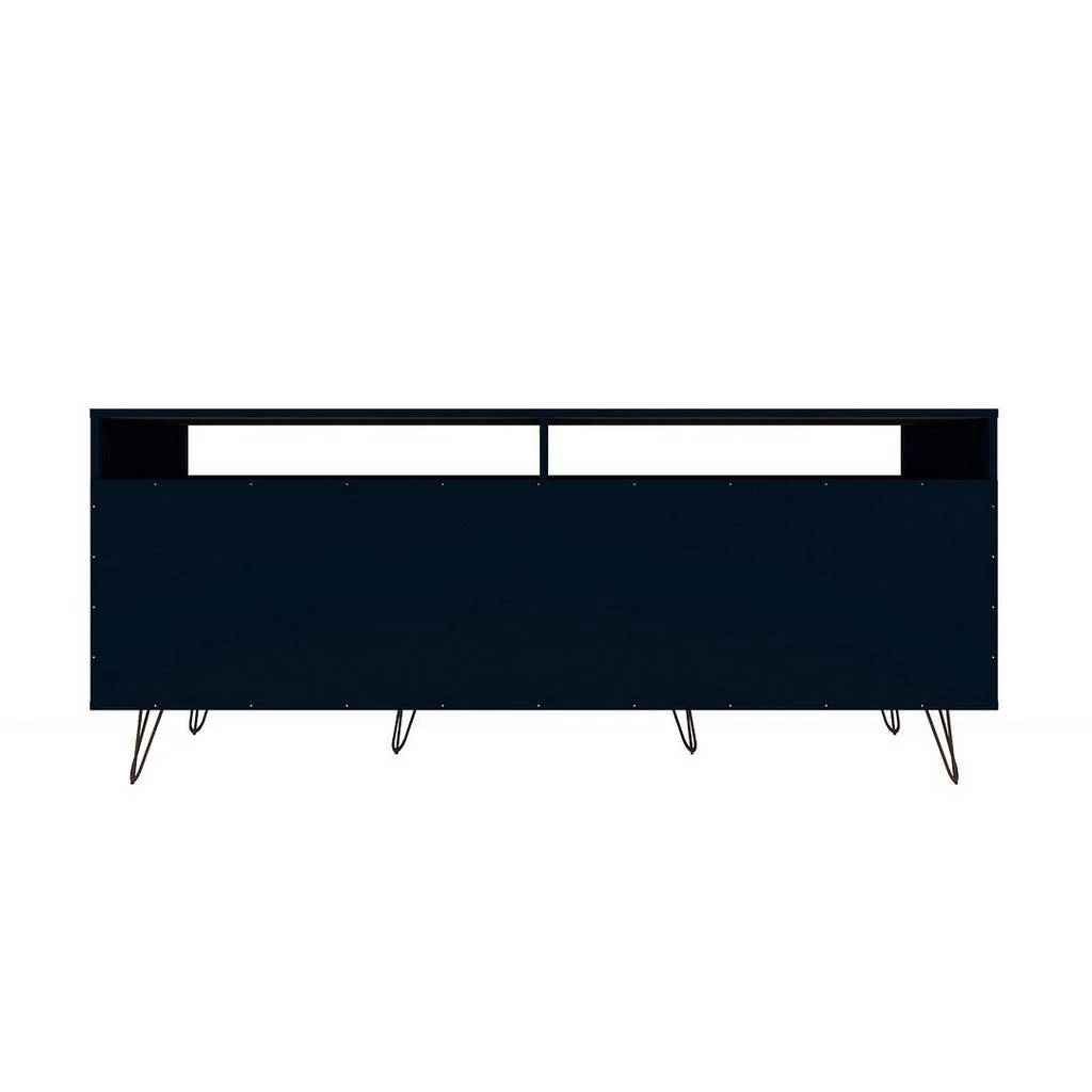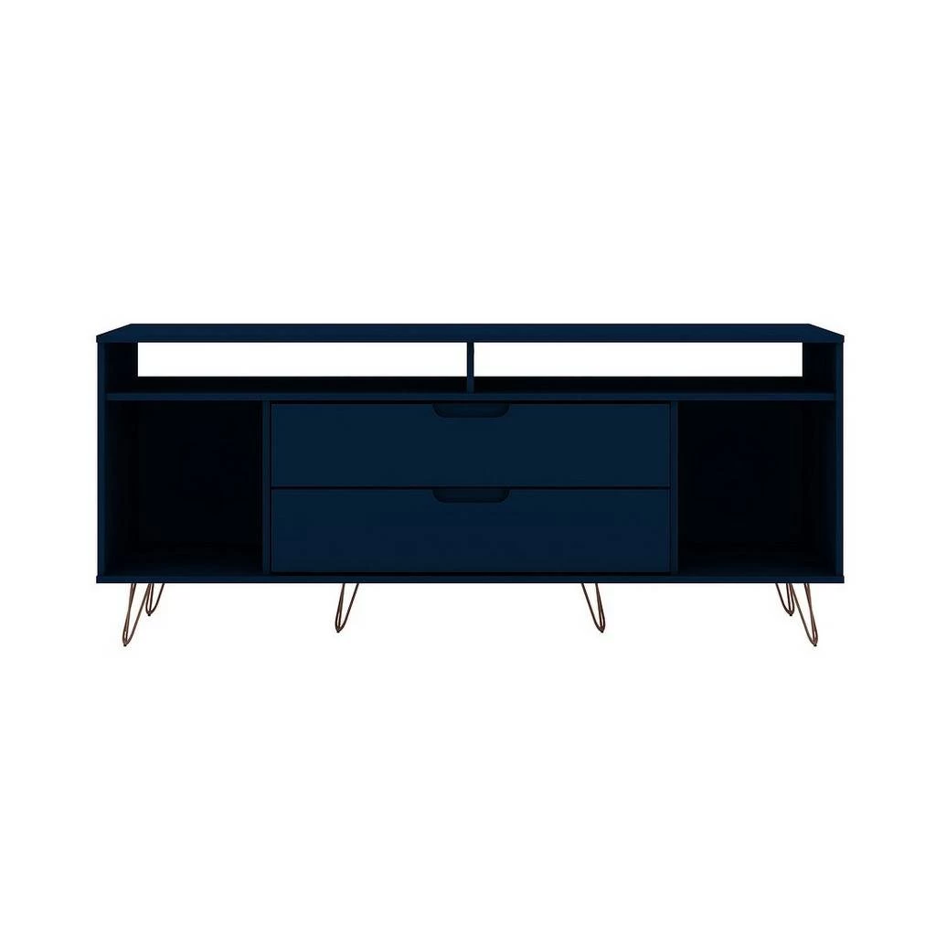 The Rockefeller TV stand is the mainstay that’s both the perfect media and entertainment focal point with ample storage space perfect for keeping DVD players and media accessories on display in lower open shelves beneath the TV or tucked away in two seamless lower drawers. Two open shelves on each side offer space for showcasing decorative accents baskets filled with your softest throw, and beyond. Stylish with splayed metal legs and Mid-Century design at its best, this piece gathers family and friends to create new memories together and to enjoy favorite movies.