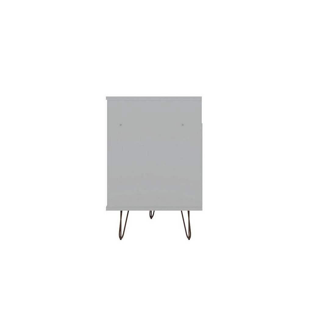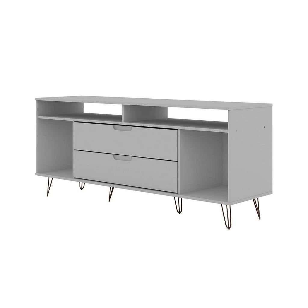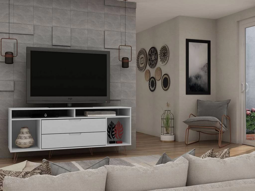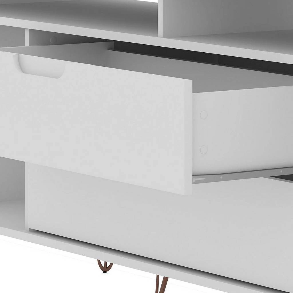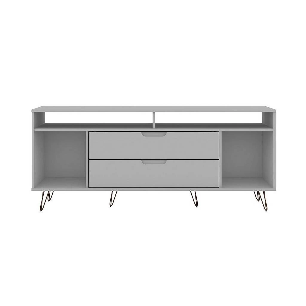 The Rockefeller TV stand is the mainstay that’s both the perfect media and entertainment focal point with ample storage space perfect for keeping DVD players and media accessories on display in lower open shelves beneath the TV or tucked away in two seamless lower drawers. Two open shelves on each side offer space for showcasing decorative accents baskets filled with your softest throw, and beyond. Stylish with splayed metal legs and Mid-Century design at its best, this piece gathers family and friends to create new memories together and to enjoy favorite movies.