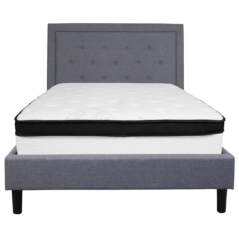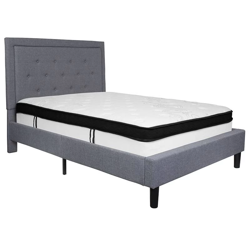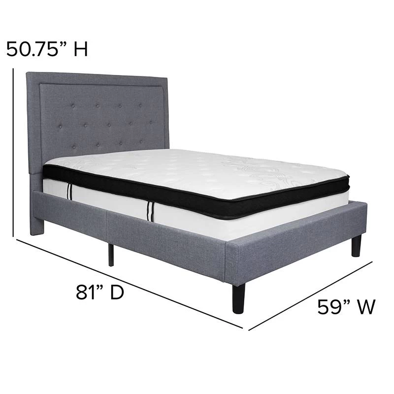 Whether you’re moving into your first apartment or home or you are ready to revamp your existing sleep space, this low profile full sized platform bed and mattress in a box set is the perfect place to start. Classic design never goes out of style. The outlined headboard features the understated look of button tufted upholstery that will always be in fashion. Platform beds are designed to give your room an open concept feel and are perfect for those who don’t like high seated beds. This hybrid full mattress, offering pocket spring support with luxurious memory foam layering, will give you the firmness you need with the softness you crave. The foam is CertiPUR-US Certified so it’s free from heavy metals, phthalates, BPDE, formaldehyde and has reduced VOCs so you can rest easy knowing the air quality in your home won’t be compromised. This 12″ memory foam pocket spring mattress sits atop 15 wooden support slats and provides superior motion isolation while supporting the contours of your body. The interior make-up has pocket spring coils and foam. Once you cut the plastic the mattress will start to expand and will return to its original shape within 48 to 72 hours. The casual style of this platform bed provides just enough character to blend seamlessly into your design scheme. [SL-BMF-26-GG]