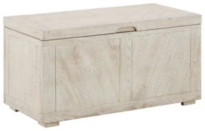 Perfect for storing throw blankets or other linens, this Ryker storage trunk is a stylish space-saving solution. Its distressed white finish paired with the diamond pattern top create an irresistible vintage vibe. Simply open the hinged top for a versatile storage space.