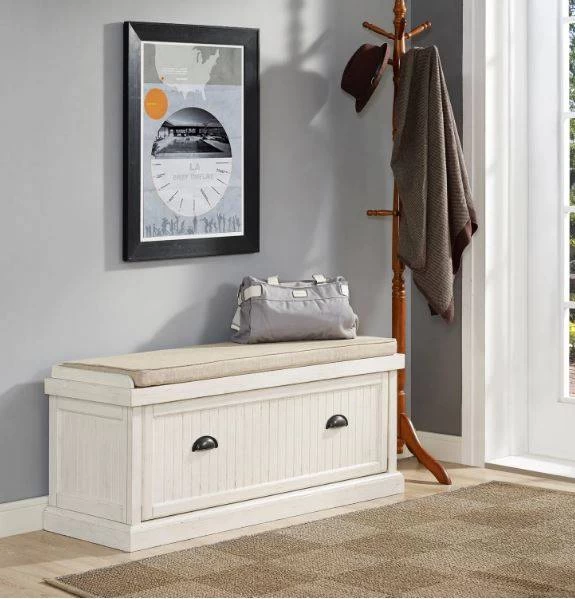 Capture the feeling of an upscale coastal home with the Seaside Entryway Bench. The bench’s cushioned seat is perfect place to sit a slip on your shoes, or it can be a landing zone for your everyday essentials. Featuring two large storage cubbies behind a drop-down cabinet door, this bench makes hiding everyday clutter a breeze.