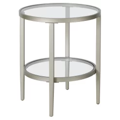 Hera 19.63” Wide Round Side Table With Clear Glass Shelf In Satin Nickel – Hudson & Canal ST1627