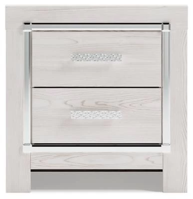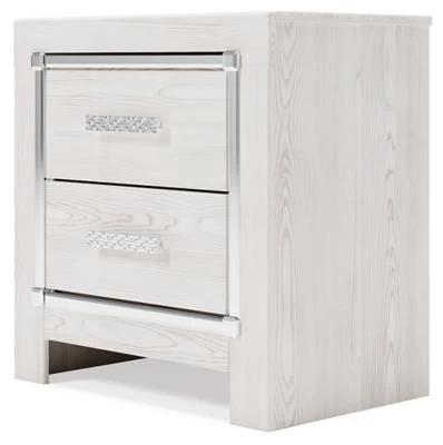 The epitome of fashion-forward design, the Altyra nightstand is a beautiful blend of comfort and luxury. Shiny chrome-tone accents, a pearlized finish and mosaic pulls bring a glam touch to the richly rustic appearance. With wireless and plug-in charging options, this bedside table adds style and modern conveniences to your restful retreat.
