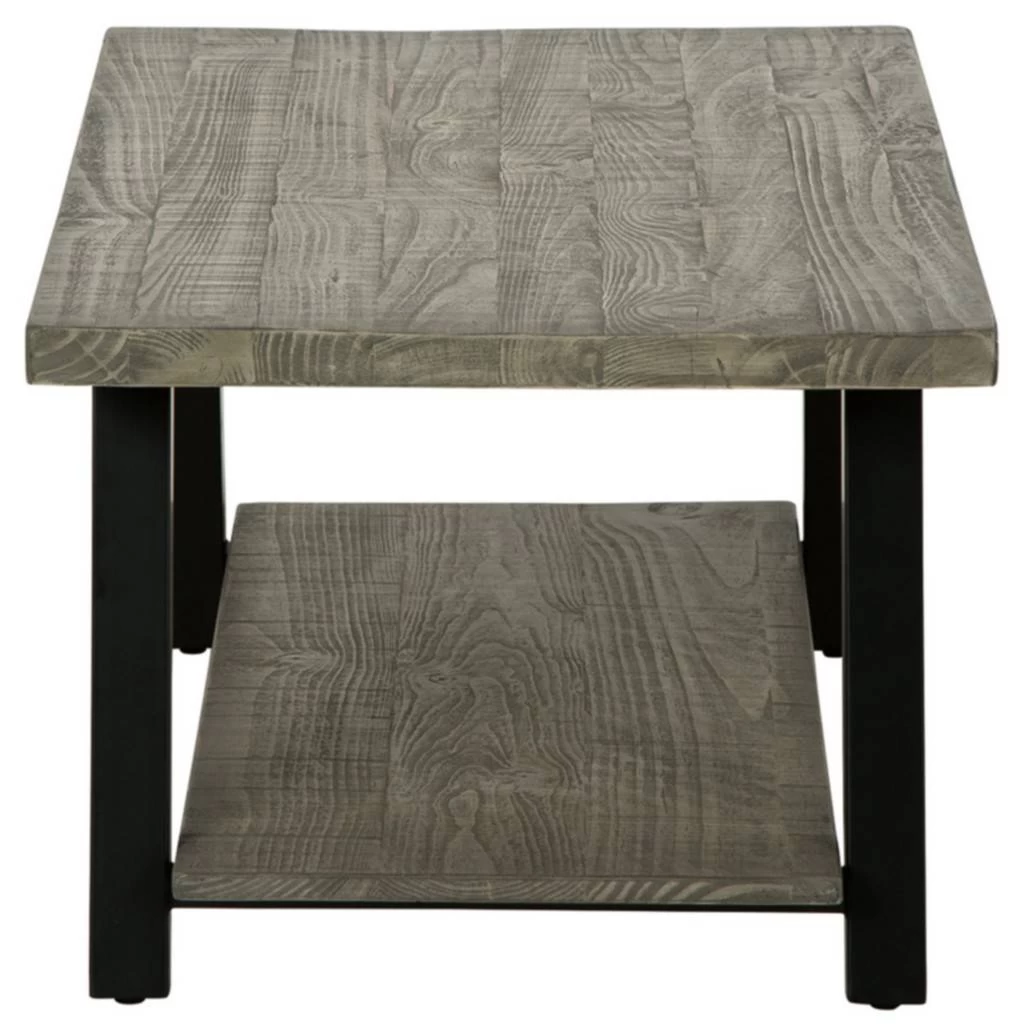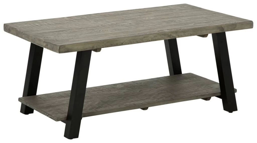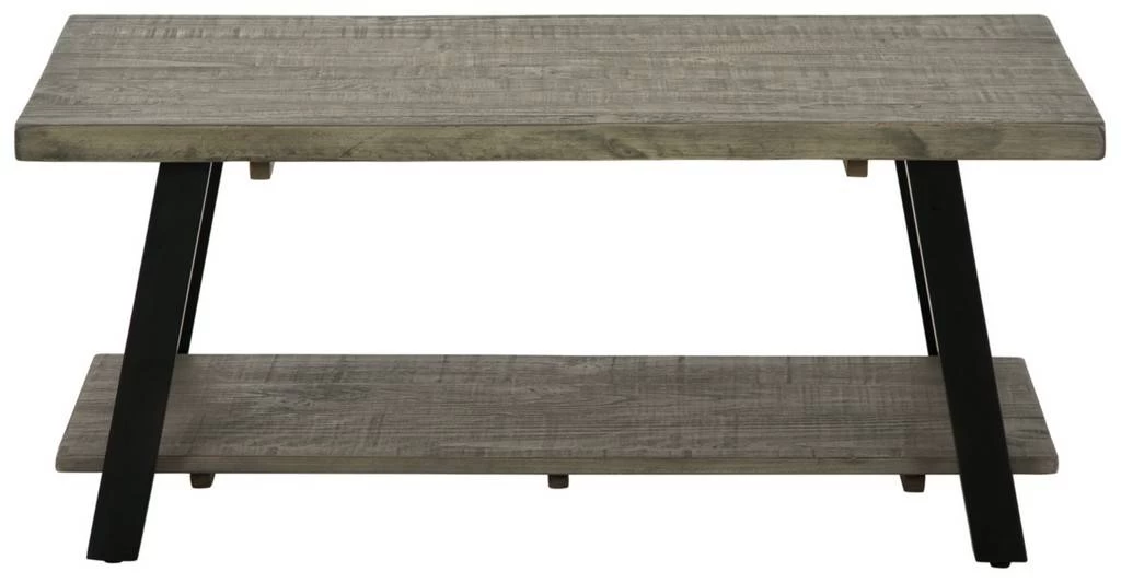 This rectangular coffee table is an achievement in urban contemporary styling. Its ultra-cool design pairs a thick slab-style tabletop and an open lower shelf of solid pine wood with linear metal legs. A weathered gray finish keeps the aesthetic warm and inviting.
