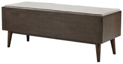 Style gets a practical upgrade with the two drawers of the Chetfield bench. The warm brown finish topped with a reversible cushion upholstered in gray fabric works in so many styles. Finished off with tapered legs and black-finish metal drawer pulls, this piece adds an efficient charm to your home.