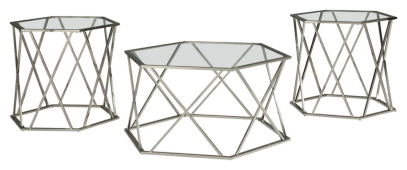 With its sculptural, hexagonal design, the Madanere coffee table set lets modern minimalism beautifully take shape. Chrome-tone metal merged with clear glass is sheer brilliance.