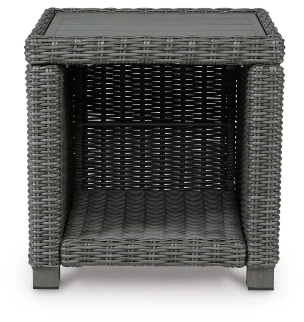 Add a distinguished touch of gray to your outdoor living space with this end table. This head-turning table is made with resin wicker over an aluminum frame for a relaxed look that provides seasons of enjoyment. Its aluminum top combines the exceptional durability and weather resistance you need with the “wood look” finish you love. With patio chairs and tables, you have all the ingredients needed for an engaging, fun-filled evening flavored with plenty of entertainment. For the very best in value, selection and price, Ashley is your go-to destination for the finest in elegant al fresco living.