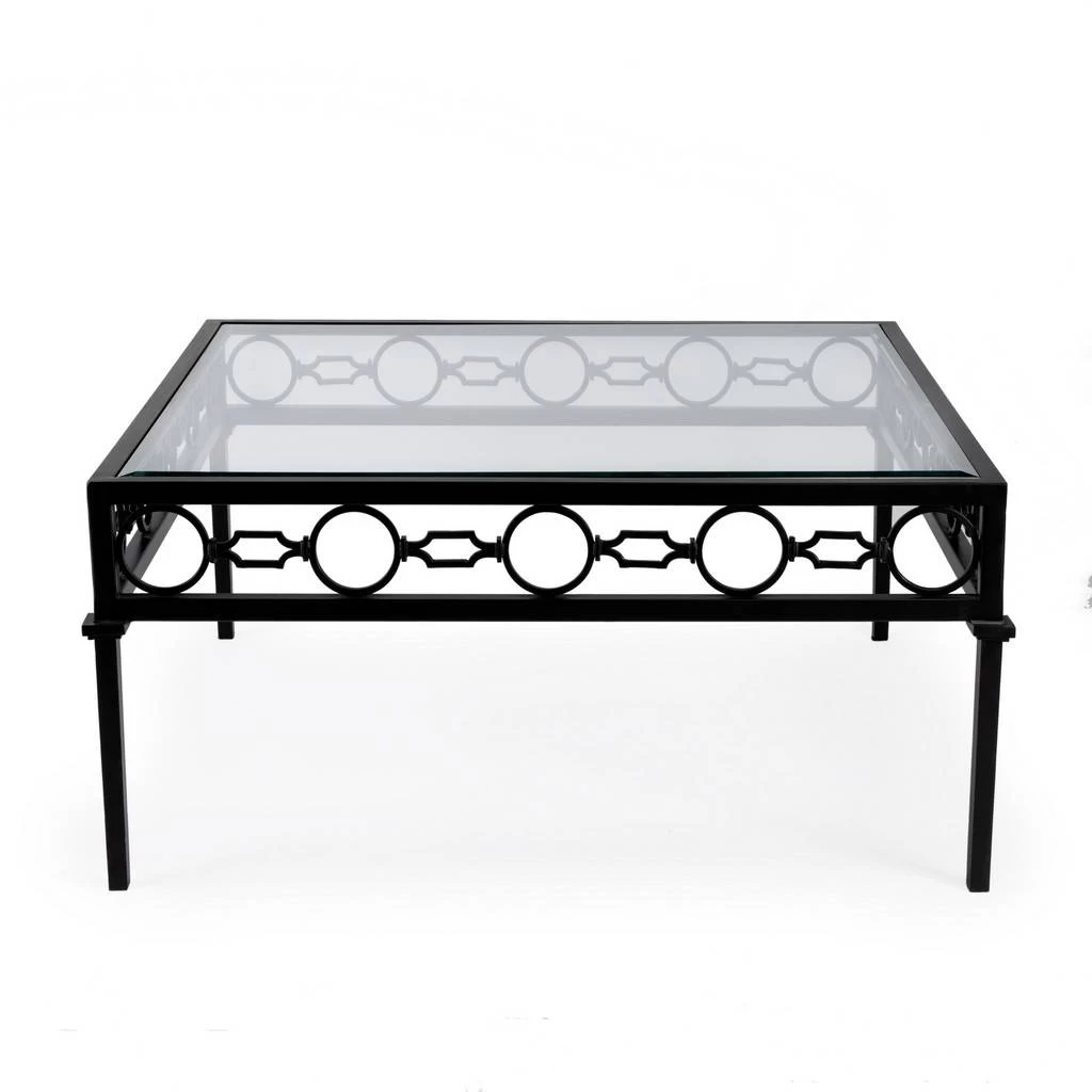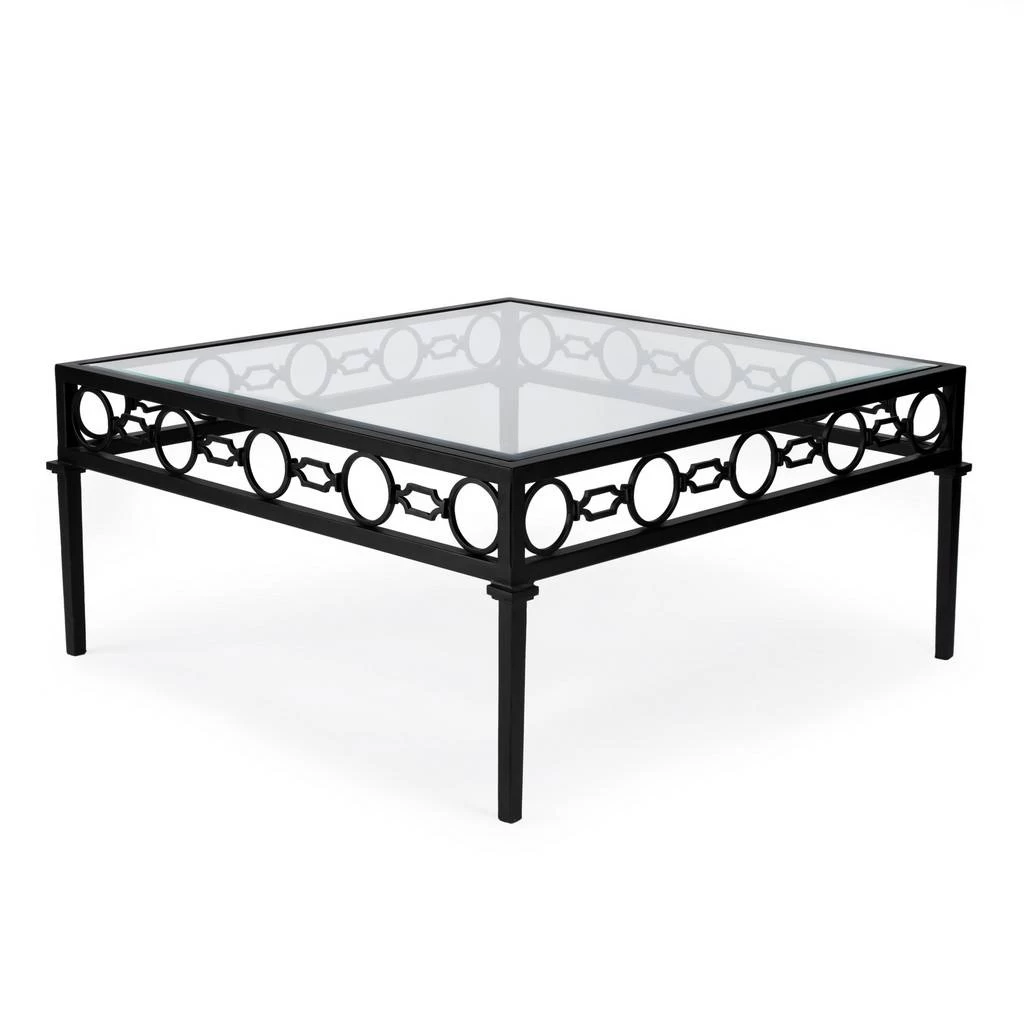 It’s 5 o’clock somewhere. Grab a drink and cozy up around the Southport coffee table. Made of a black iron frame and clear glass top, this coffee table is substantial in size measuring 38.5″W x 38.5D x18″H. It’s forged geometric pattern.