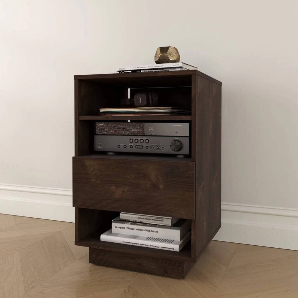 Stereo Collection from Nexera is a trendy and easy to live entertainment collection offered in a rich Truffle melamine finish. Stereo Audio Cabinet from Nexera features 1 storage drawer and 3 open storage spaces for your electronic components; the media cabinet also features a removable back panel to allow easy wire access and optimal air flow. The Stereo Audio Cabinet can be paired with matching Stereo TV Stand for a complete home entertainment set.