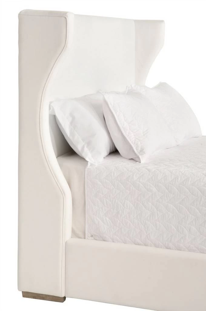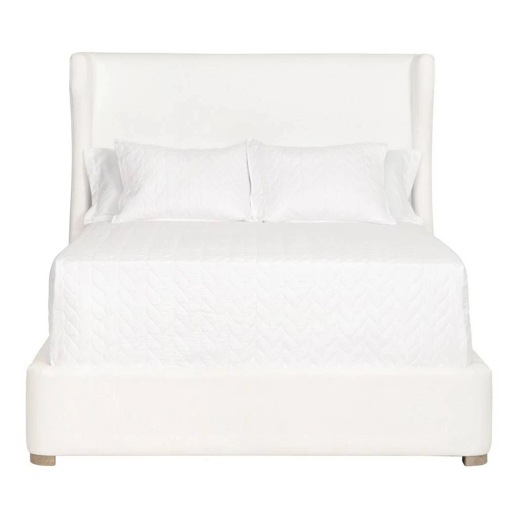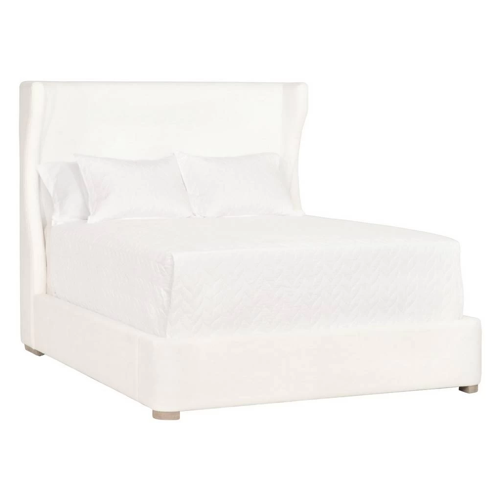 This upholstered Cal King bed frame will add sophistication and class to any . The Livesmart Peyton Pearl fabric and oak feet create a neutral palette that will work well with many color combinations. The frame features curved wingback sides, an integrated metal slat system and stain resistant fabric. Additionally, the edges are piped to add dimension to the frame. Designed for dependability and durability, this transitional style Cal King bed frame will be a great addition to your bedroom.
