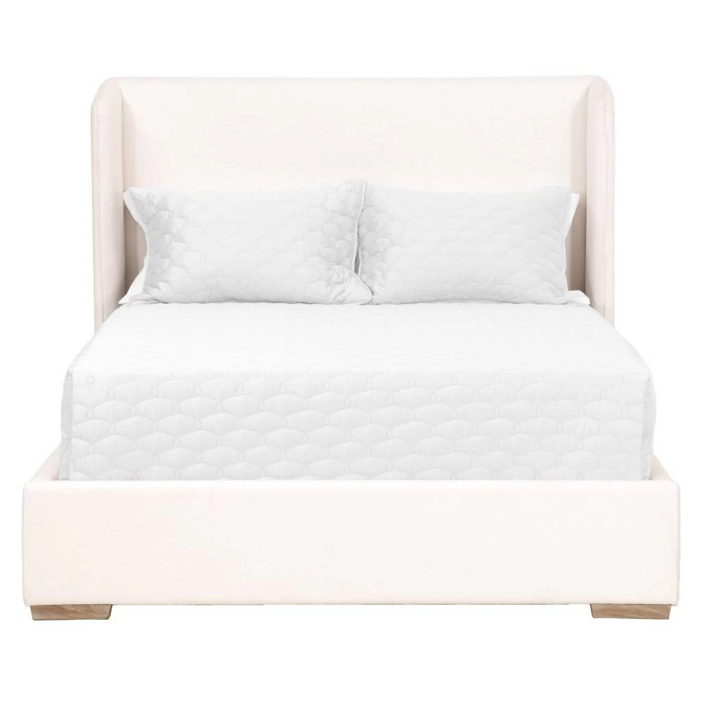 This wingback upholstered queen bed frame will add sophistication and class to any . The Livesmart Peyton Pearl fabric and solid oak feet create a neutral palette that will work well with many color combinations. The frame features a removable metal frame European slat system and stain resistant fabric. Designed for dependability and durability, this transitional style queen bed frame will be a great addition to your bedroom.