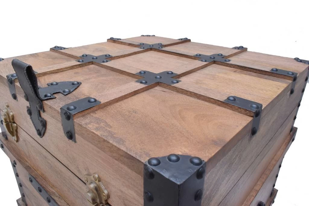 A great storage trunk that will not take up too much space. Created from rich mango and finished in a gorgeous burnished natural color enhancing its charm. Leather, antique brass, and iron accents only add to this beauty. Will work with many styles and finishes. Spacious interior for clothes, magazines, or whatever you want for your hidden storage needs. Use as an end table or nightstand for even more function.