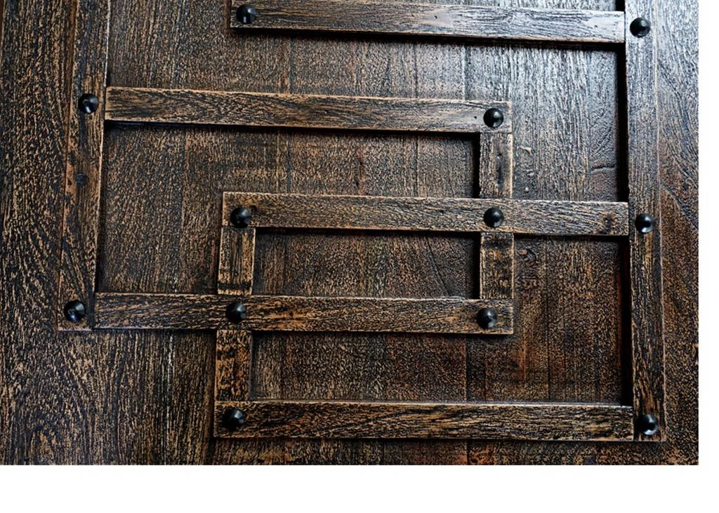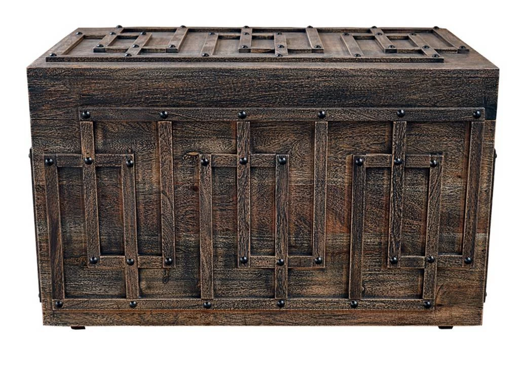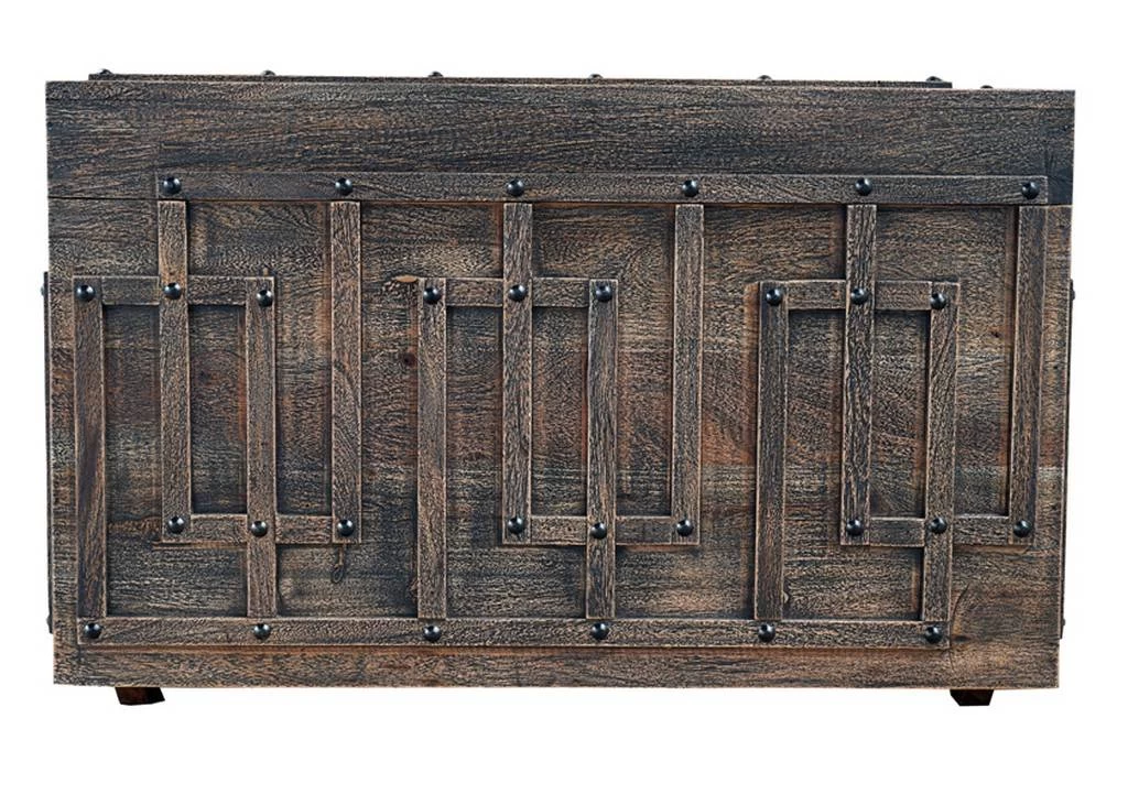 A great trunk for your storage needs but even better for your decorative needs. Finished in a handsome blackwash finish with a hand carved infinite geometric shapes linked by black iron nailhead trim. Is really quite a dramatic statement and will compliment almost any style. The top opens up to an enormous space for storage, Close it up and use as a cocktail table or bench. Function at its best.