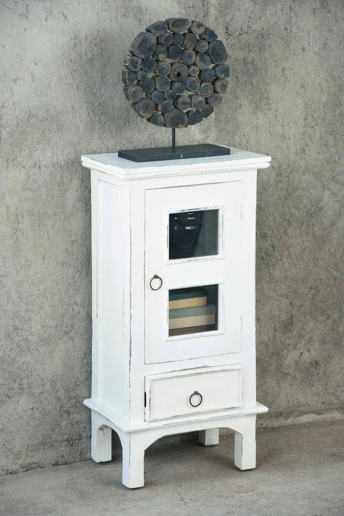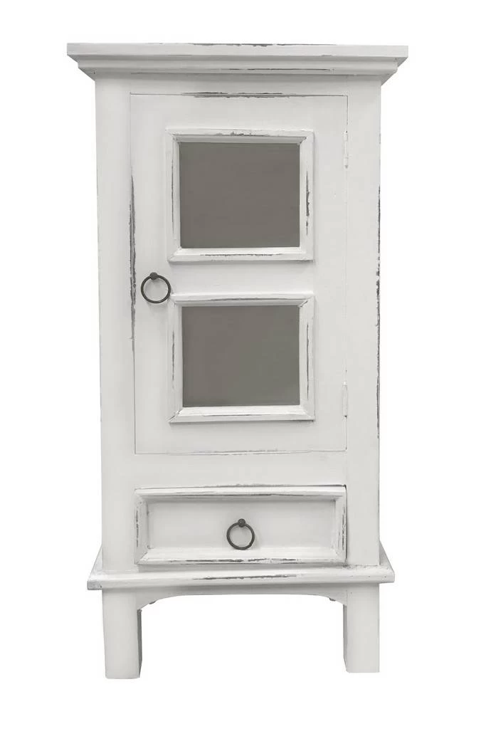 Farmhouse country and cute, with lots of space inside to boot. Storage becomes stylish, this one door, one drawer chest is shabby chic at its best. The vintage white finish of this space saving small cabinet is sure to update your guest or entryway. Fully assembled, just take it out of the carton and set it in your home right away.