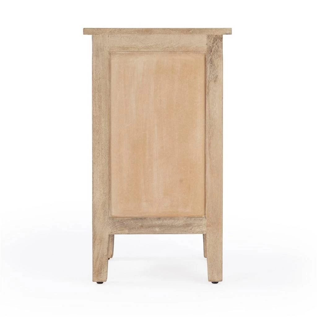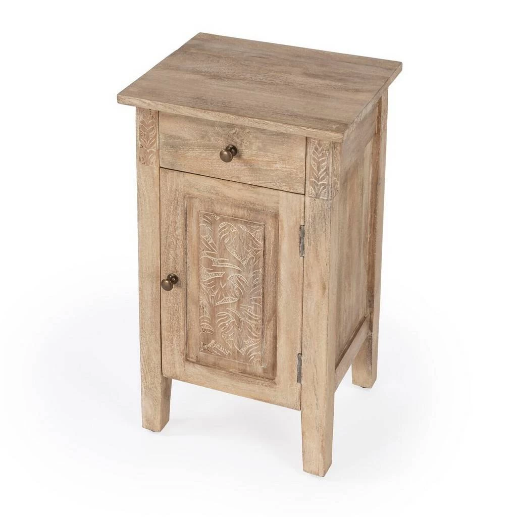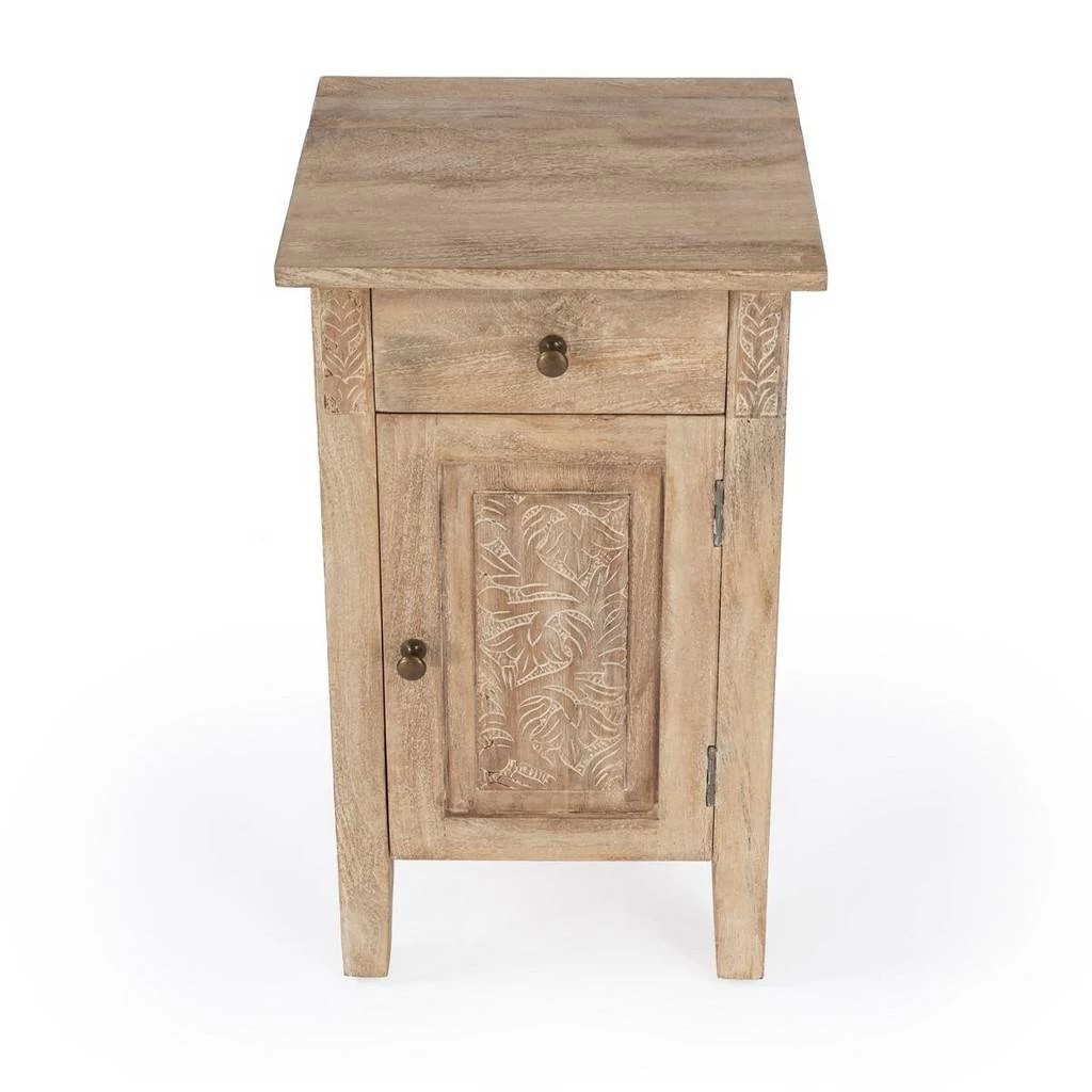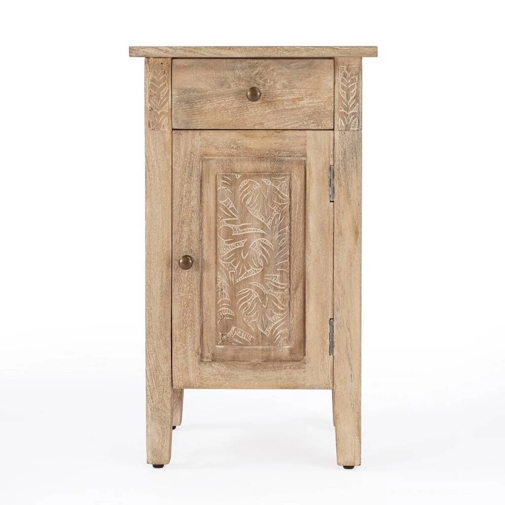 The Switra one drawer one door end table brings a natural and unique look to your living room , or anywhere in your home. The hand-carved floral etching in the door front and framework showcase the beautiful artisan crafted detailing. The piece offers one small storage drawer on top and a larger space on bottom. The natural distressing of the mango wood and the pairing of the brass knobs create a unique piece you will adore for years.