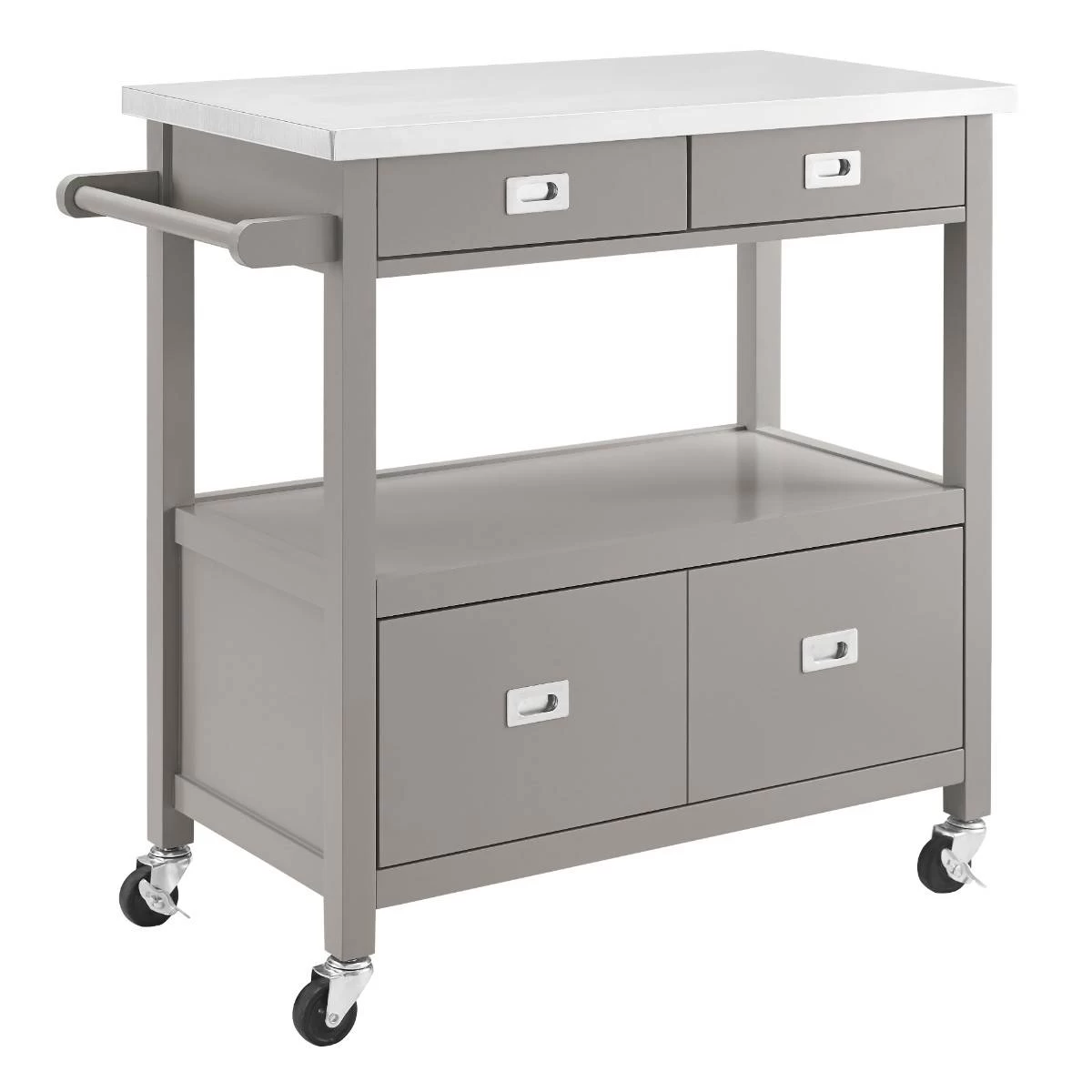 The Sydney Kitchen Cart is perfect for adding additional storage and work prep space to any kitchen. The spacious top and bottom drawers provide storage for gadgets and kitchen essentials, while the storage shelf is ideal for keeping bulkier items. The stainless steel top makes it easy to clean, while the easy roll casters provide for simple movement throughout your space. Finished in a neutral gray, it will easily complement any existing .