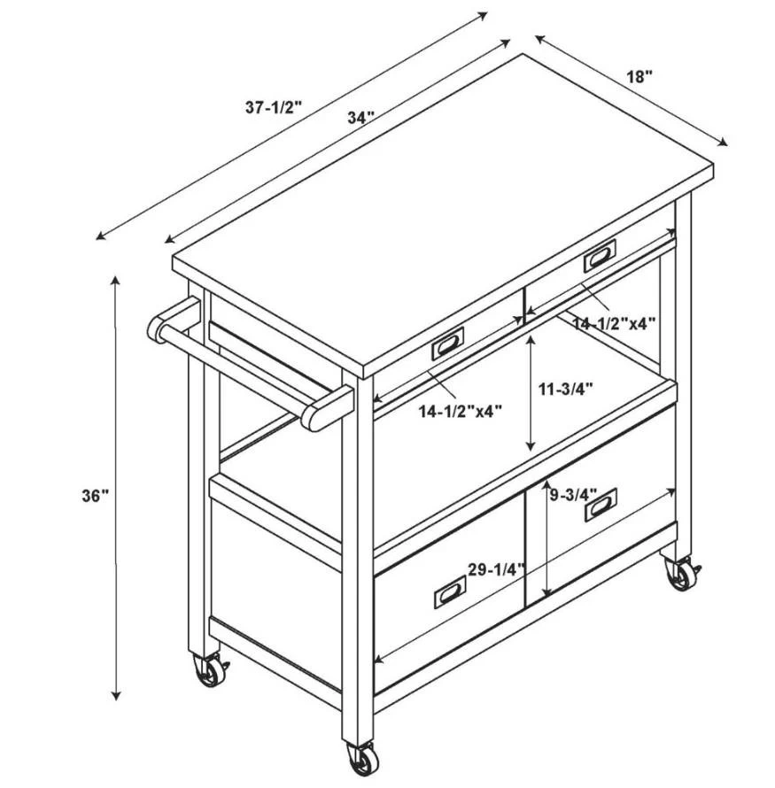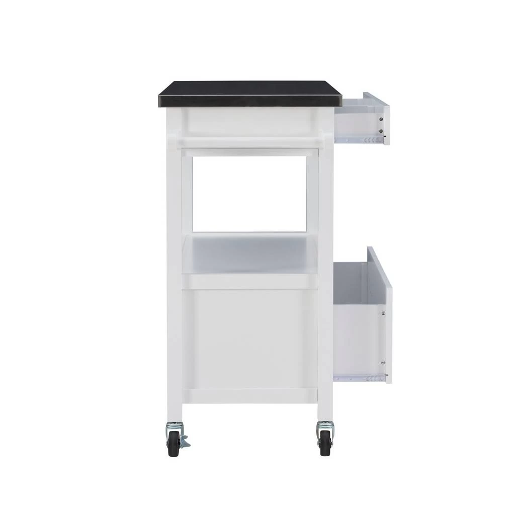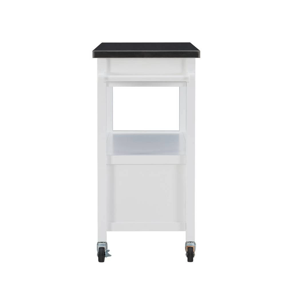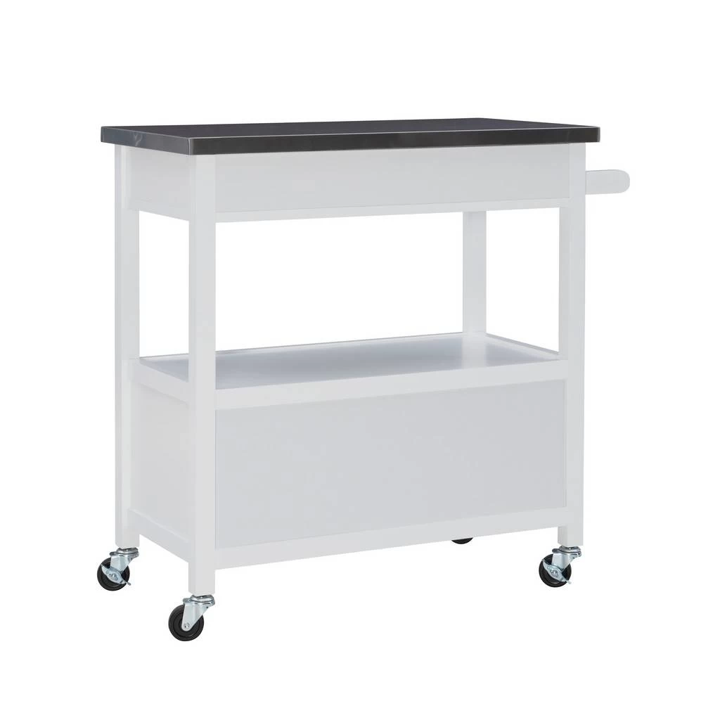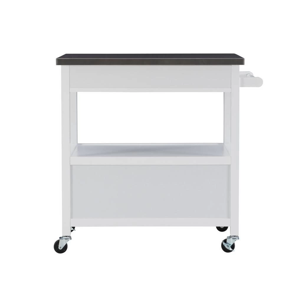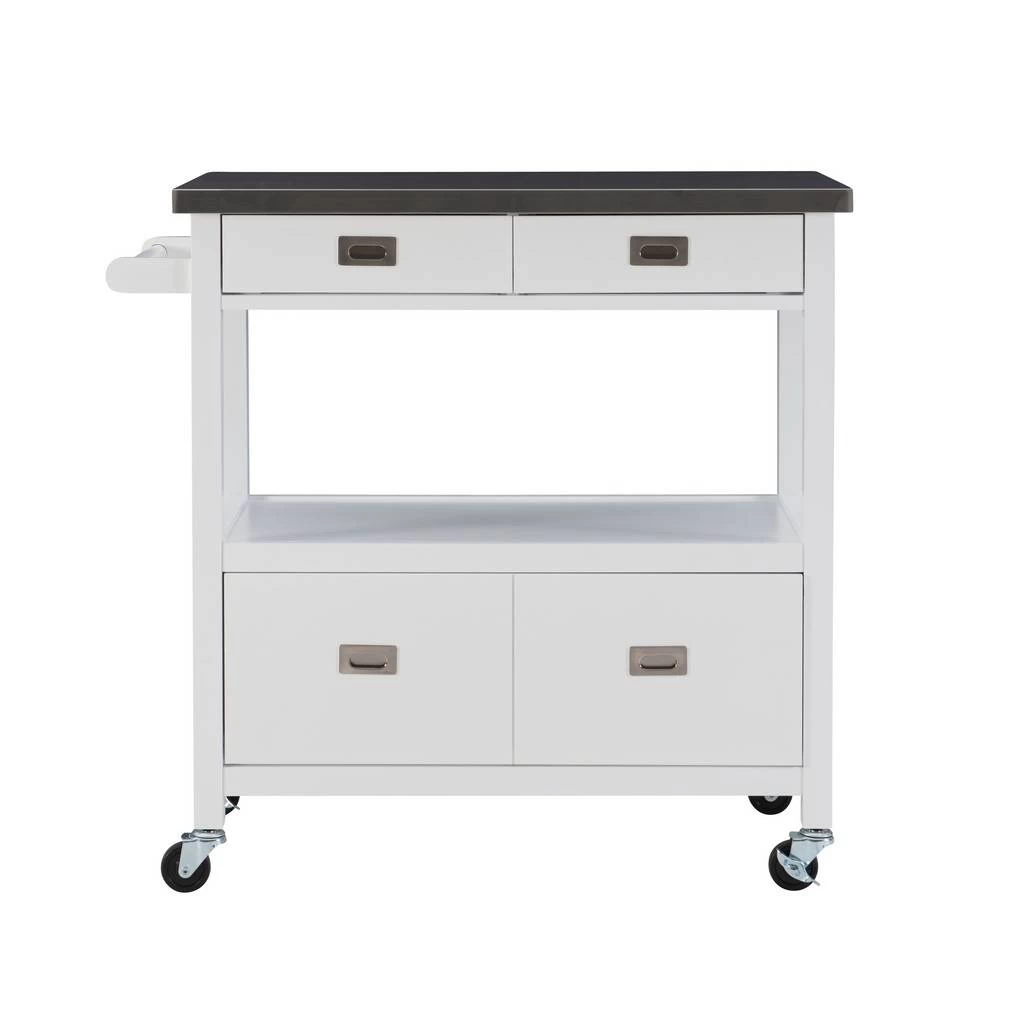 Refashion your kitchen with this spacious mobile cart. One large and two small drawers offer hidden storage to keep your space uncluttered. The classic design features a food safe, easy to clean stainless steel top that accommodates a coffee maker or full size microwave. Matching drawer pulls, plus a convenient open shelf and side towel bar complete the look. Need to move your cart for entertaining? No problem with easy rolling, locking casters. A glossy white finish makes this island at home in any room.