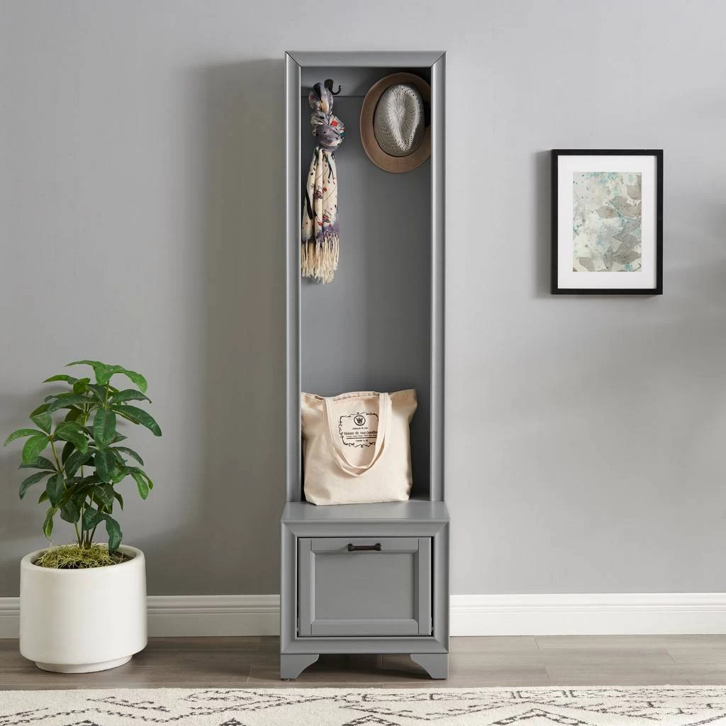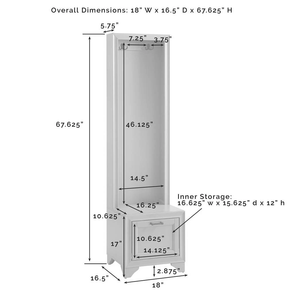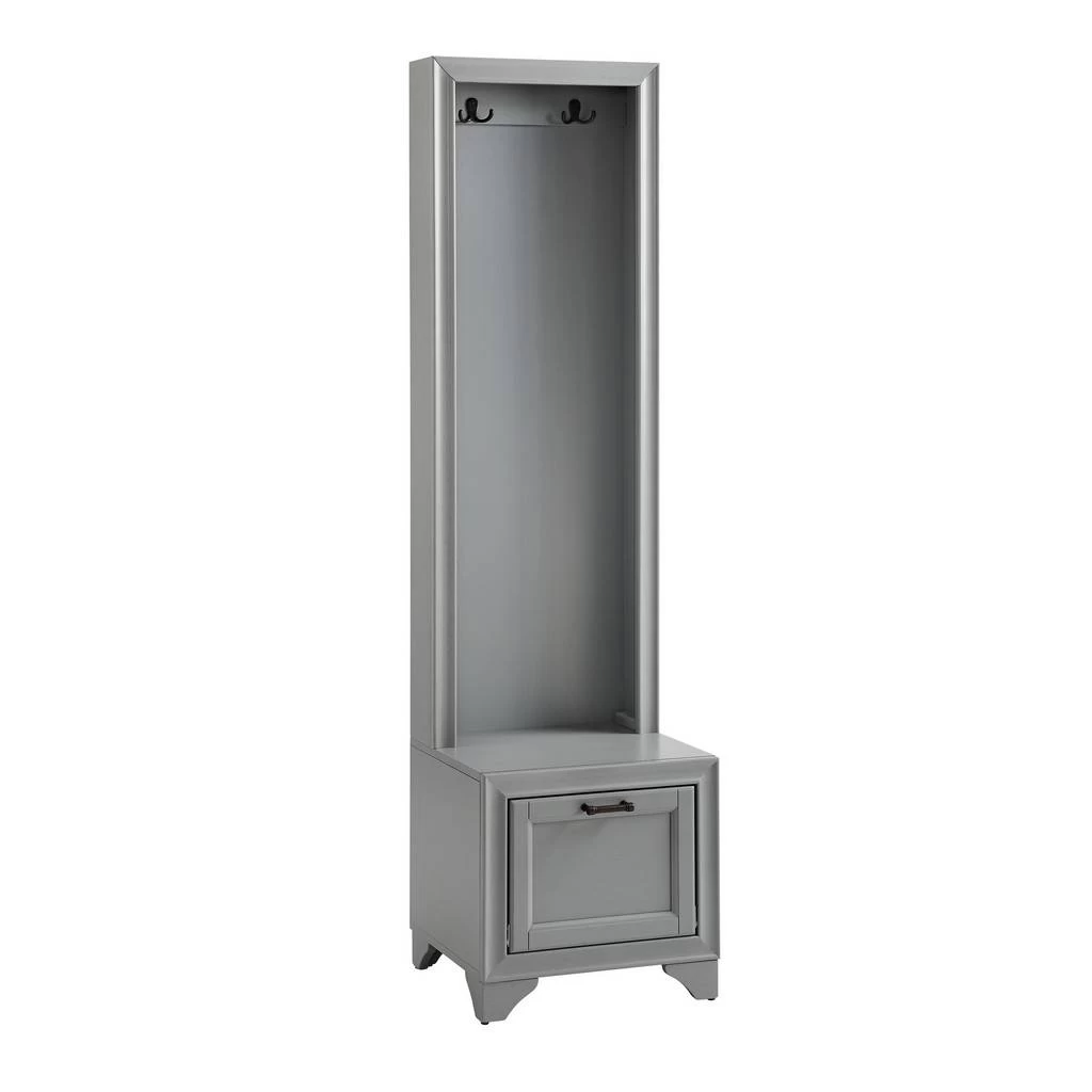 Space conscious and stylish, the Tara Hall Tree adds much-needed storage to small entryways. The slender profile offers two double prong hooks for hanging coats, hats, and book bags. A spacious lower compartment has a hinged fold-down door with magnetic closure just right for storing shoes at the end of the day. The lower cabinet also creates a seating area or landing zone, making the Tara Hall Tree your go-to for home organization.