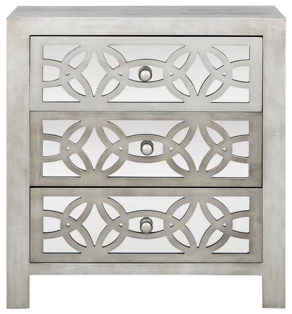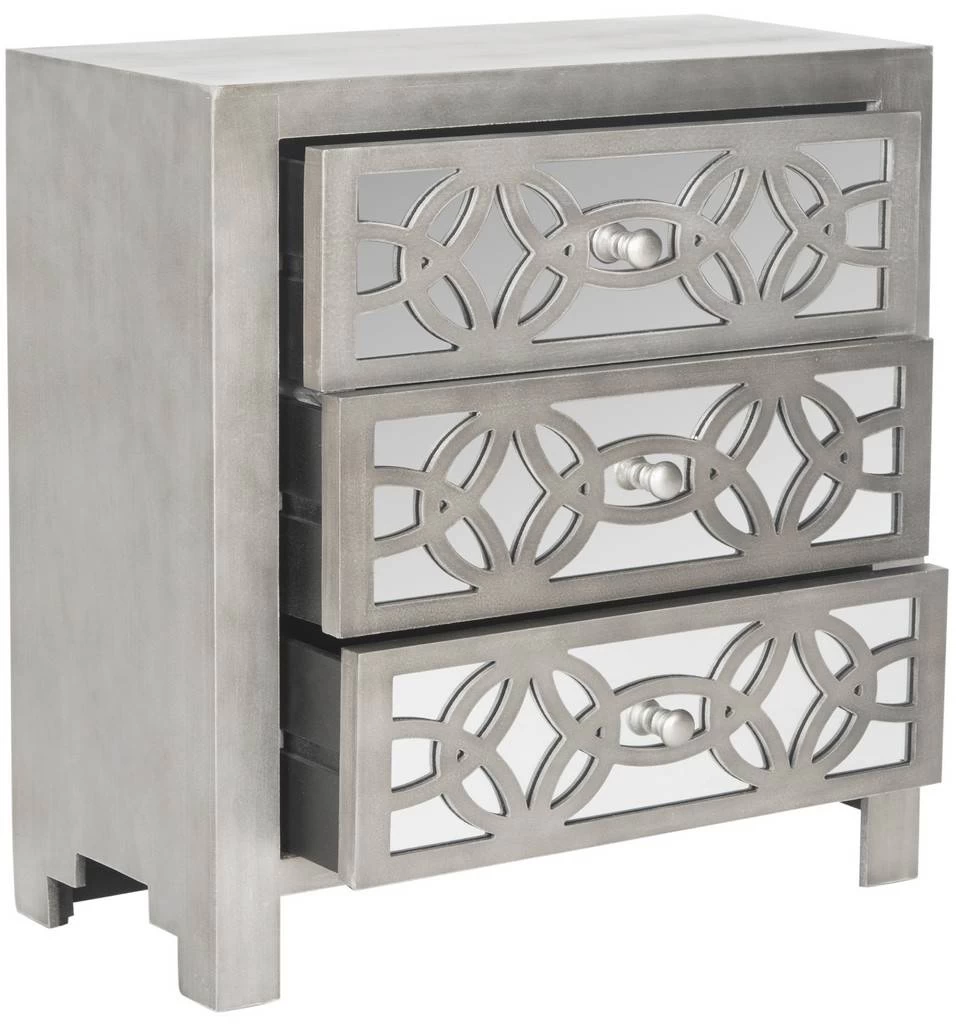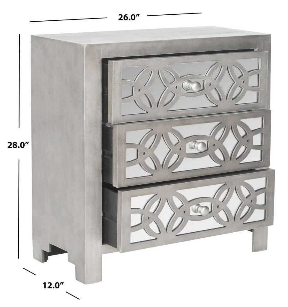 A stunning fusion of country charm and modern glamour, this Tasha 3 Drawer Chest breathes new life into any interior. Mirrored drawer fronts form a striking guilloche pattern that shines against its soft grey frame, making for timeless, fashion forward décor.