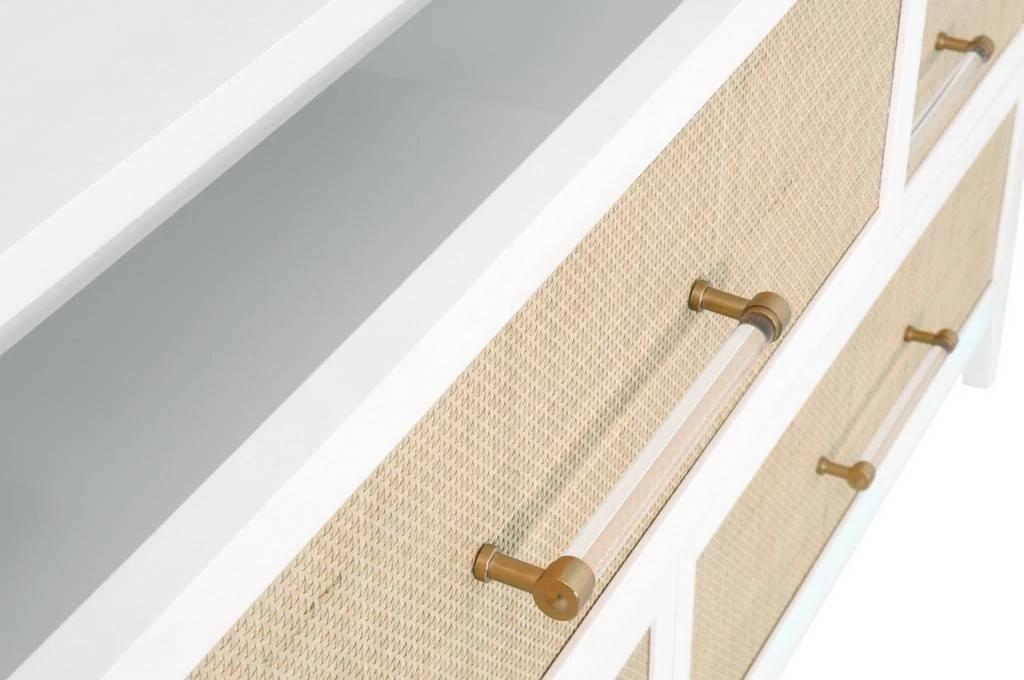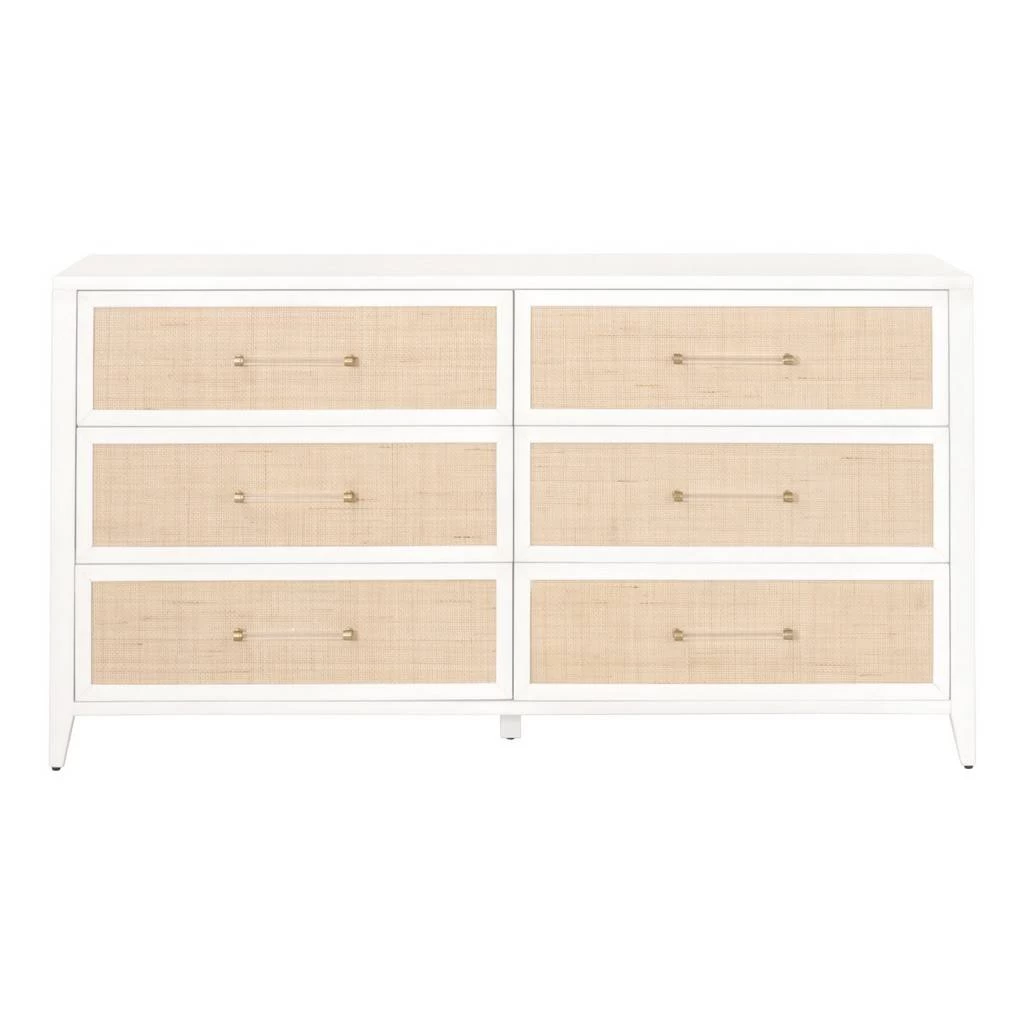 Transitional style 6-drawer double dresser in matte white featuring natural rattan door front inlay with brass and acrylic decorative hardware. Tradition Collection’s Natural Rattan finish is a natural material that includes unavoidable variation in color, texture, blemishes and marks. These features are not defects, but rather the material’s natural characteristics. By ordering products from this collection, you accept the natural characteristics unique to each item and agree that no claims will be approved regarding these natural variations. Special care should be taken to protect these finishes.