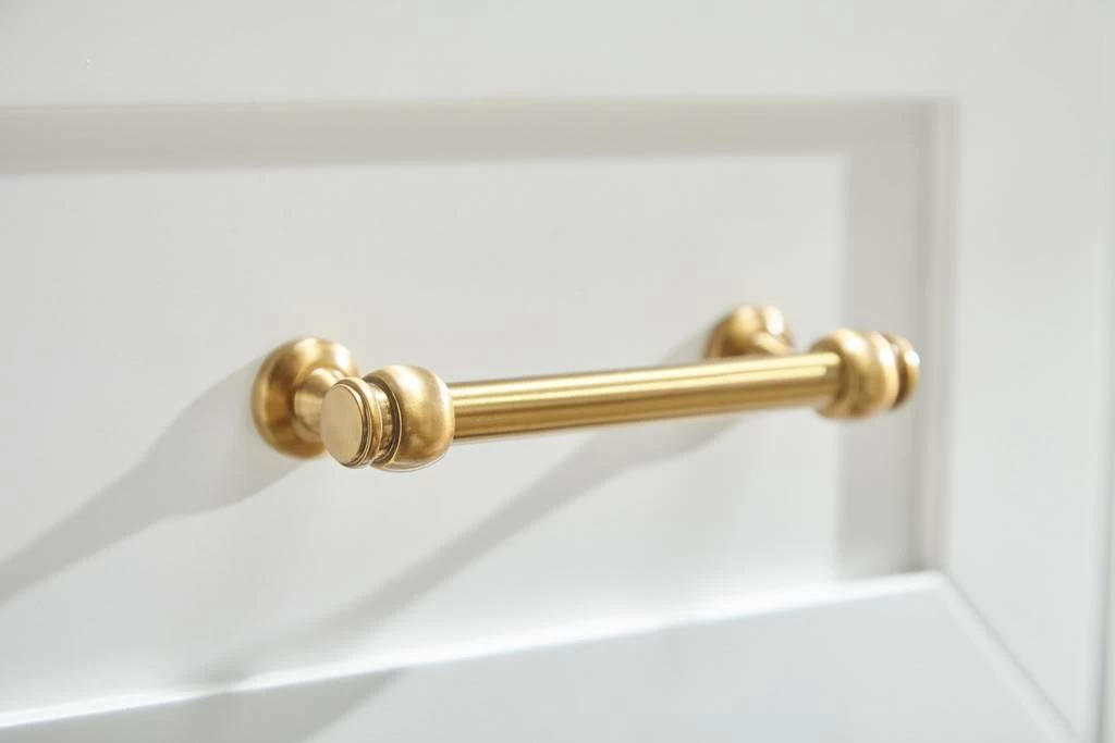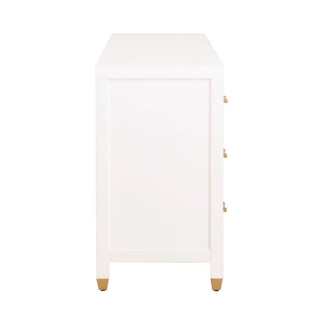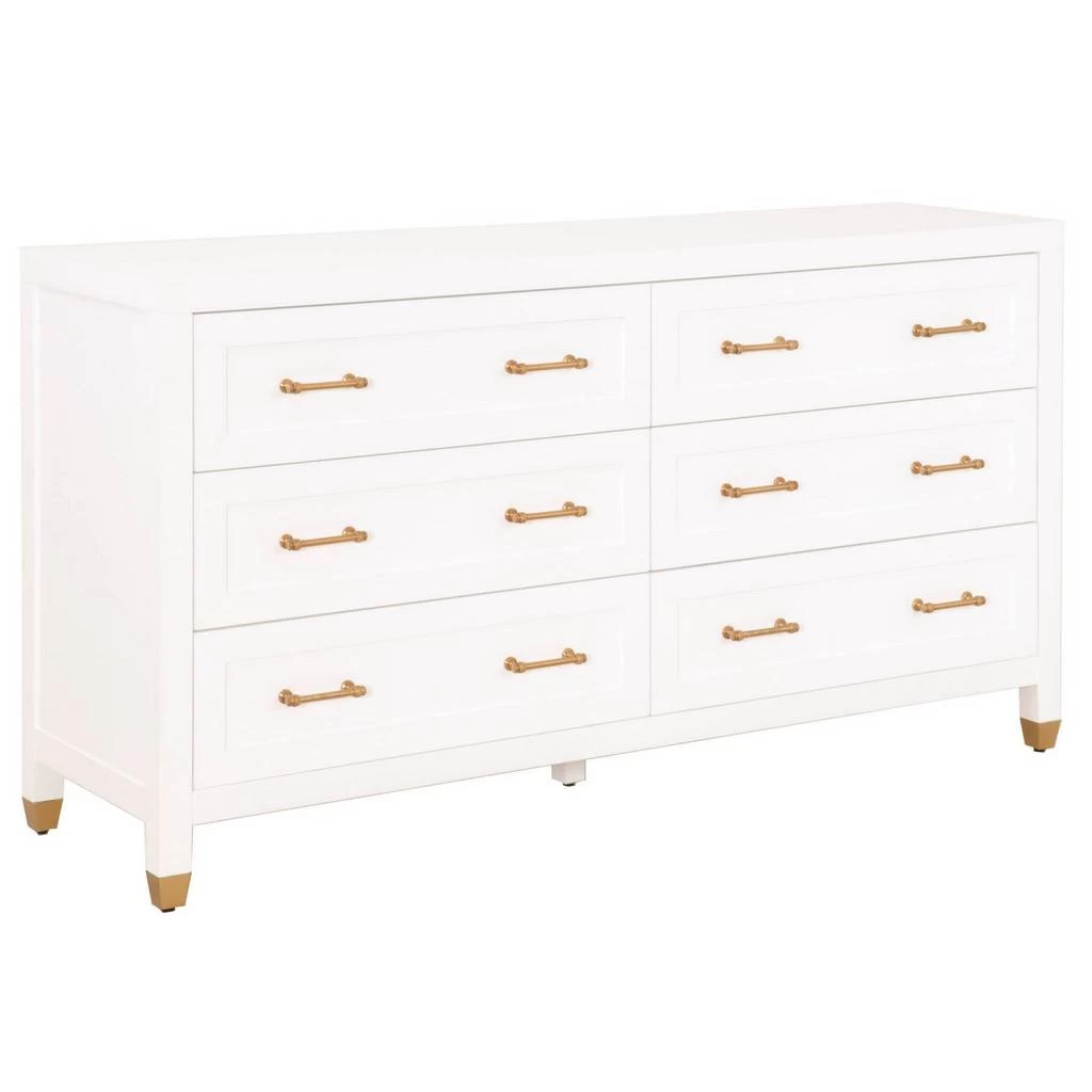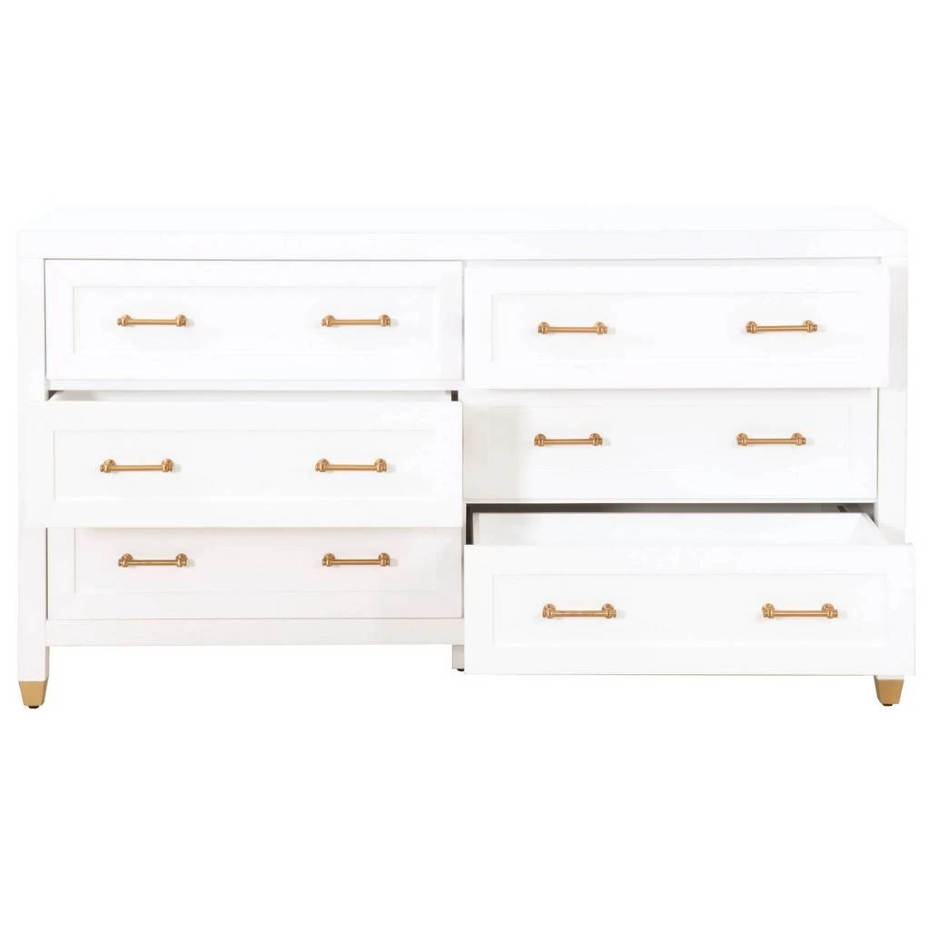 A sophisticated double dresser with a modern flare. Constructed with 6 large storage drawers, this matte white dresser has plenty of space to store clothing and display pictures, perfume bottles or a television on top. It is accented with brushed brass pull handles and hardware, giving this double dresser a transitional look that will be a great addition to your .