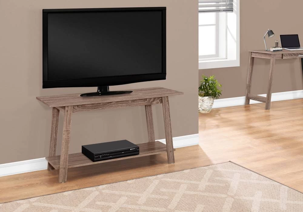Add a touch of style to your entertainment room with this contemporary TV stand. The large bottom shelf will accommodate your audio visual components / gaming accessories /books or decorative objects. Finished in a sophisticated dark taupe / this versatile TV stand can be placed in a living room / guest room / den / or basement and is perfect for small homes. Accommodates all TV sizes with a center stand.