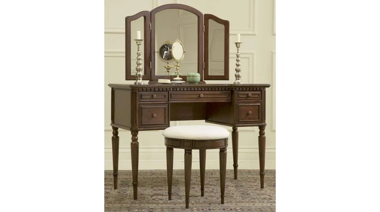 Beautifully styled vanity with tri-fold mirror and round stool.