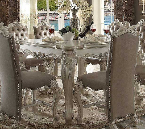 Irresistibly inviting, the Versailles collection displays the unrivaled beauty of the traditional dining. The dining table reflects highly decorative base with oversized scrolled feet. This counter height collection is available in two different colors, cherry oak and bone white, making you flexible choice on home . Chairs are sold separately.