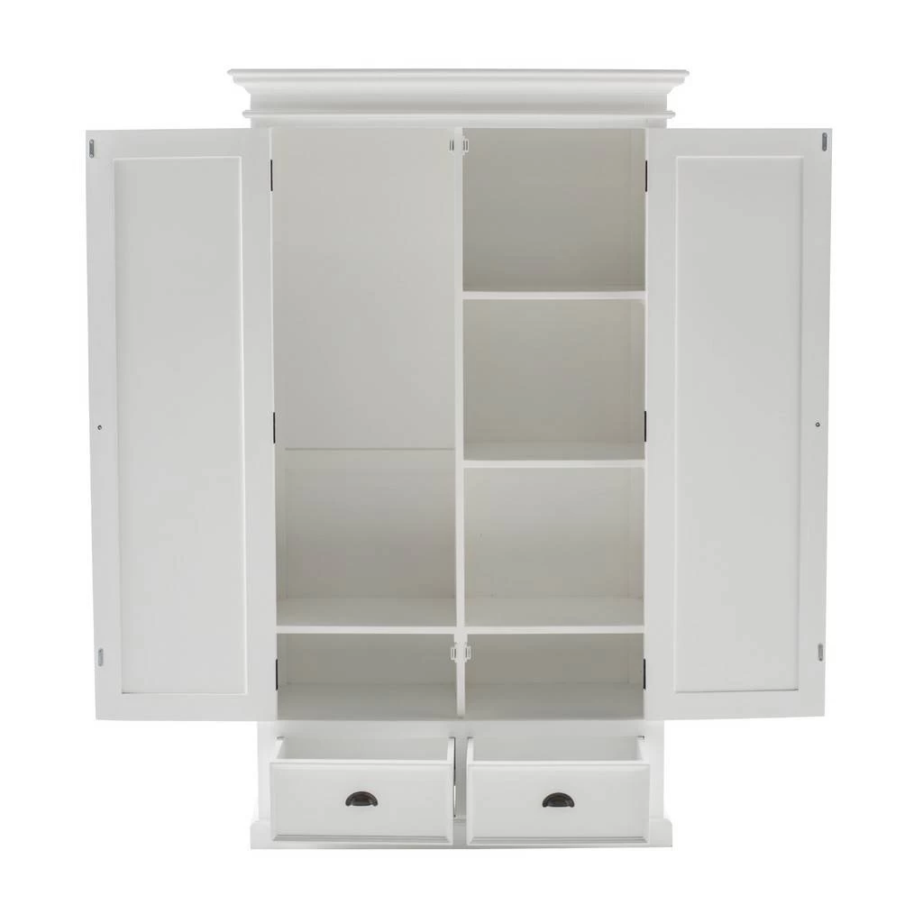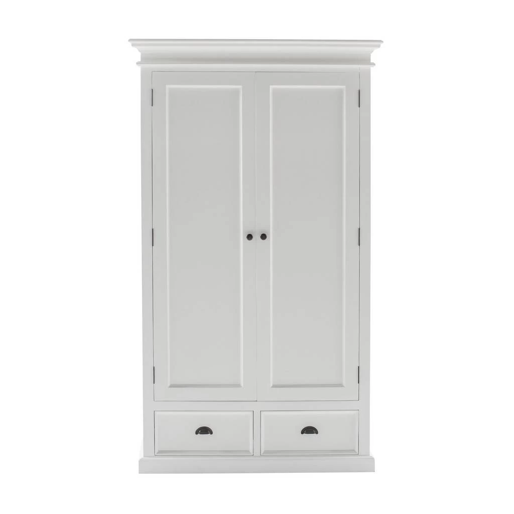 Add this mid-sized wardrobe, with its charming yet modern aesthetic, to your for additional storage and style. Handcrafted from kiln dried solid mahogany, the combination of hanging space, interior shelving and two drawers at the base offers a space for everything. This piece is finished in classic white – a perfect complementary colour – and features antique brass hardware.