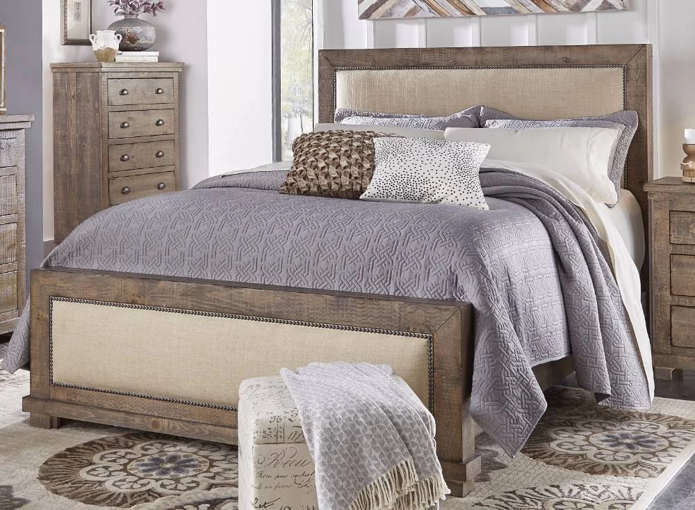 This group bestows elegance with the splendor of a unique finish and the nature of salvaged wood. Willow has three different finishes to choose from as well as two different styled beds. An upholstered bed presents a more feminine look while the thick tops and parting rails allow you to hone in on it’s substantial elements. Mitered framed upholstered bed features a linen-look trimmed in nailhead. Fabric content for upholstered bed is 100% Polyester for easy clean-ability and also has a knit backing.