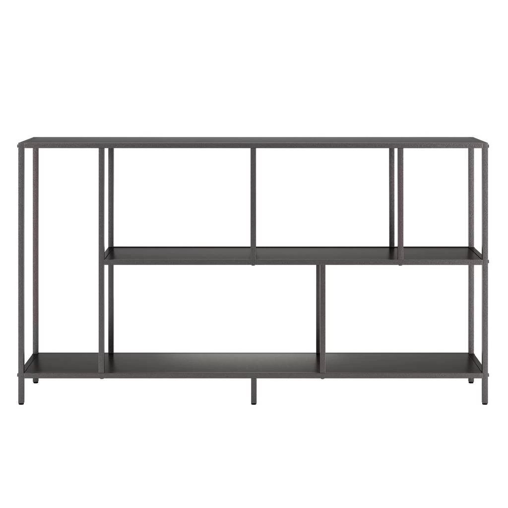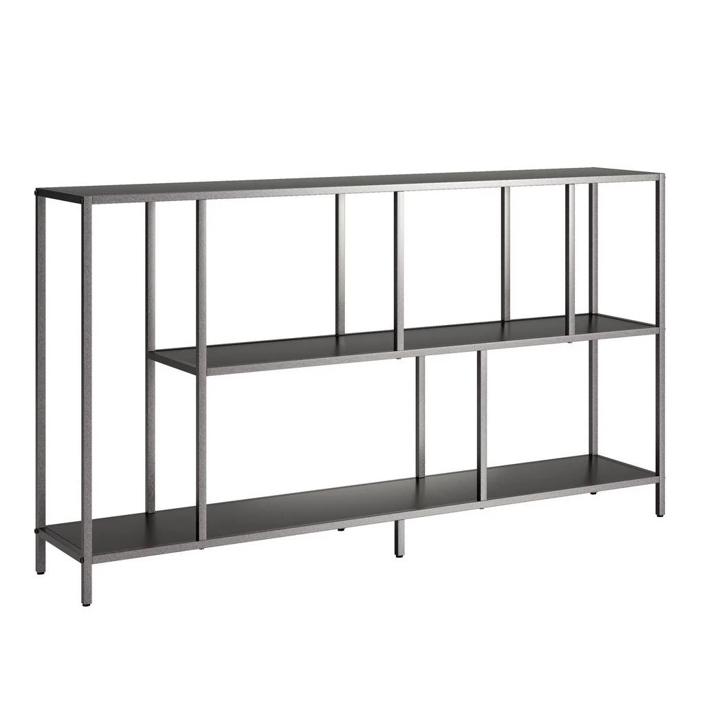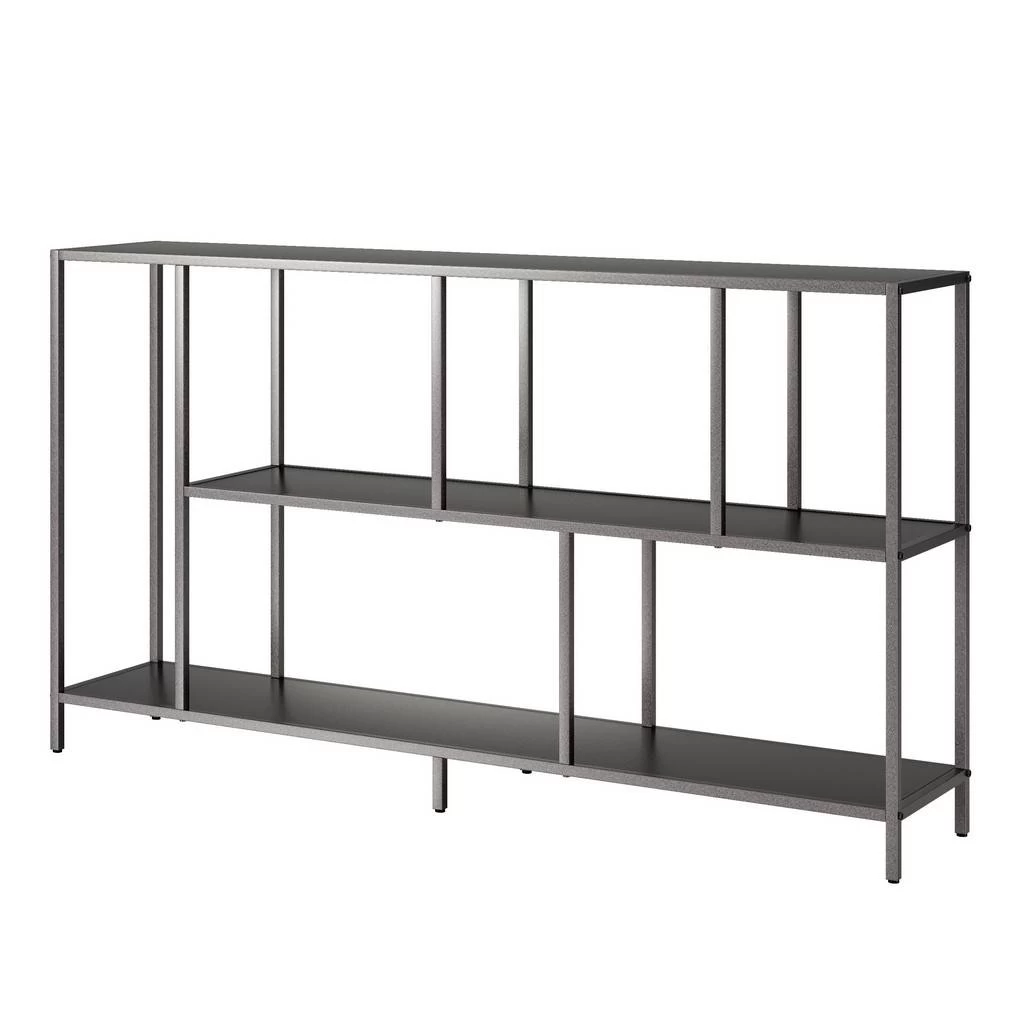 Clean, minimalist lines and sturdy tempered glass make this console table the perfect addition to your , or entryway. Proudly display knick-knacks, magazines and more on the durable steel top and staggered lower shelves. The streamlined look and neutral metallic finish pairs seamlessly with your existing color scheme and décor style.